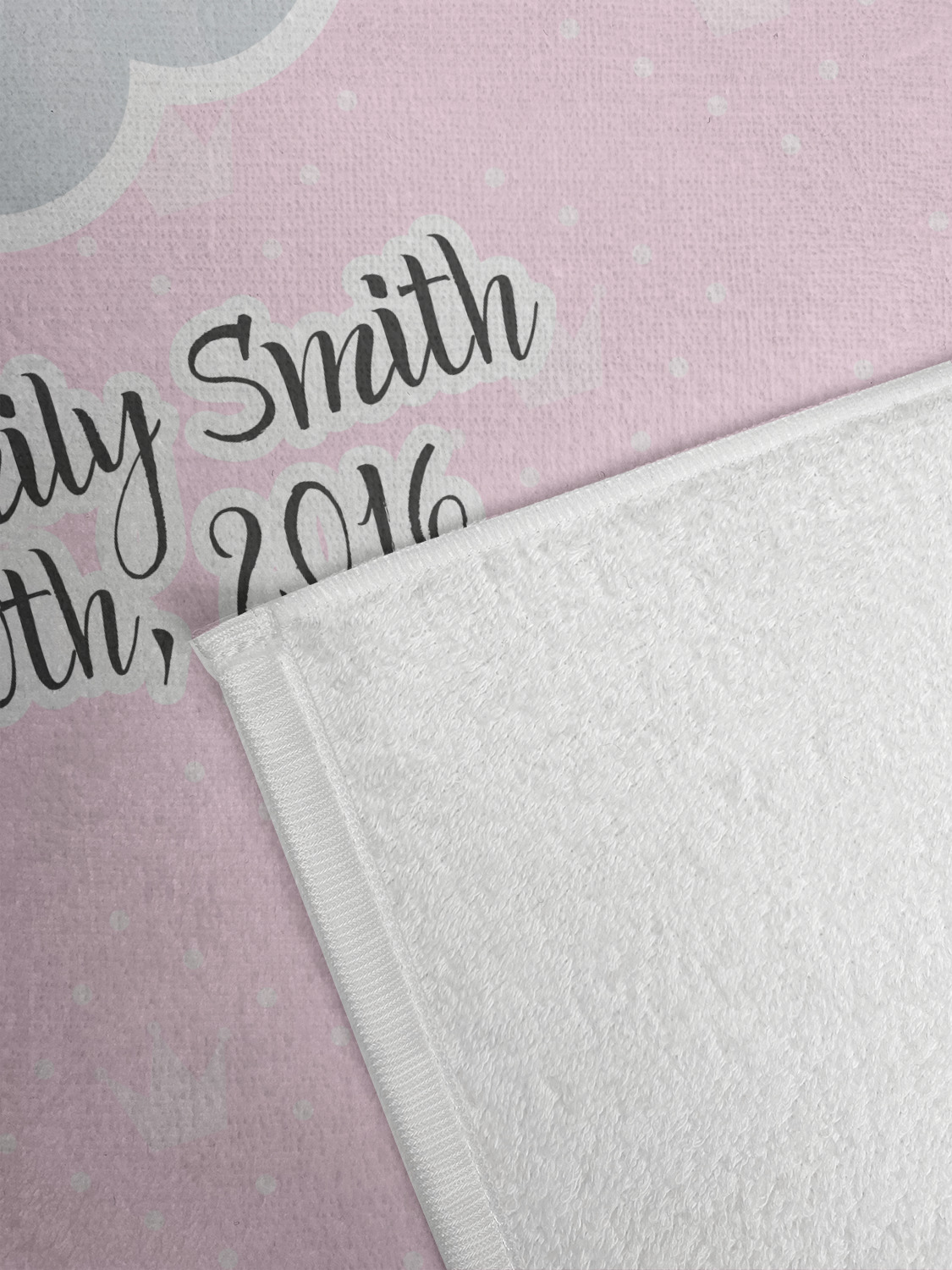This design is for baby girls. The background is a baby pink background with crowns and polka dots. In the middle of the design is a scalloped frame to upload your baby's picture into (make sure it is high quality!). Underneath you are able to put personalized text with their birthday or whatever you like.