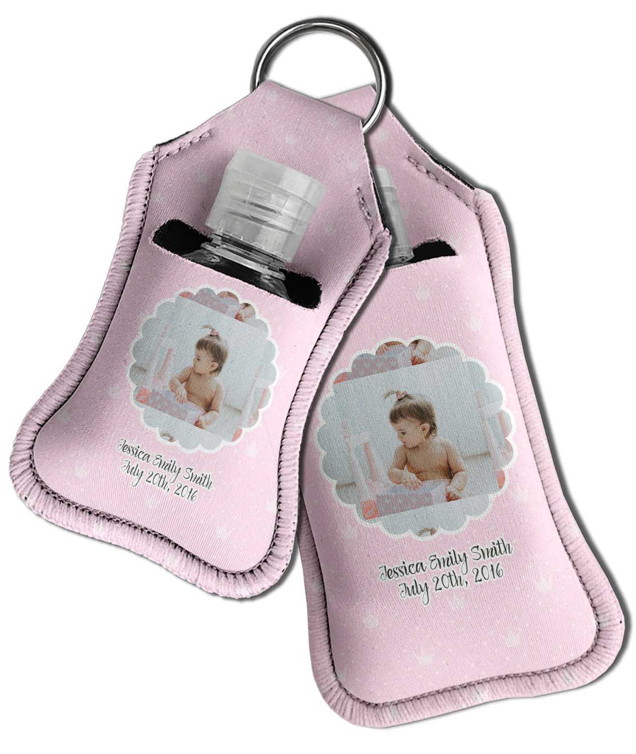 Each hand sanitizer holder comes with its own empty travel-sized, refillable hand sanitizer sure to fit snug in your customized sanitizer case! Our hand sanitizer cases are a durable, yet soft neoprene material sure to last any daily activities or travel agenda. Customize and personalize a hand sanitizer bottle holder with one of our two sizes - small (4.25" x 2.25") or large (5.5" x 2.5"). Each travel sanitizer holder comes with a keyring for attachment on bags, keys, or more!
