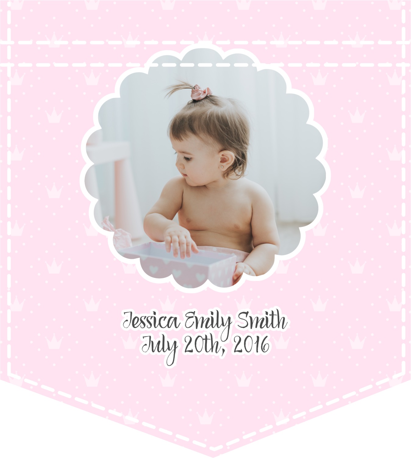 This design is for baby girls. The background is a baby pink background with crowns and polka dots. In the middle of the design is a scalloped frame to upload your baby's picture into (make sure it is high quality!). Underneath you are able to put personalized text with their birthday or whatever you like.