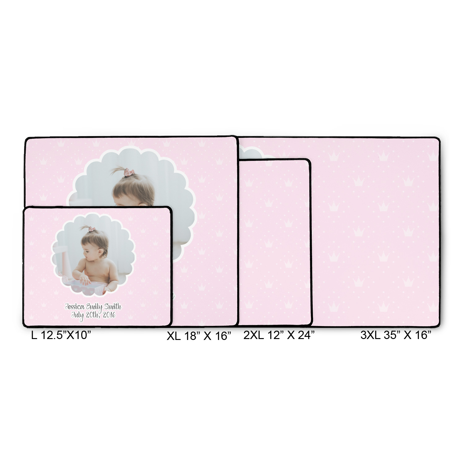 This design is for baby girls. The background is a baby pink background with crowns and polka dots. In the middle of the design is a scalloped frame to upload your baby's picture into (make sure it is high quality!). Underneath you are able to put personalized text with their birthday or whatever you like.