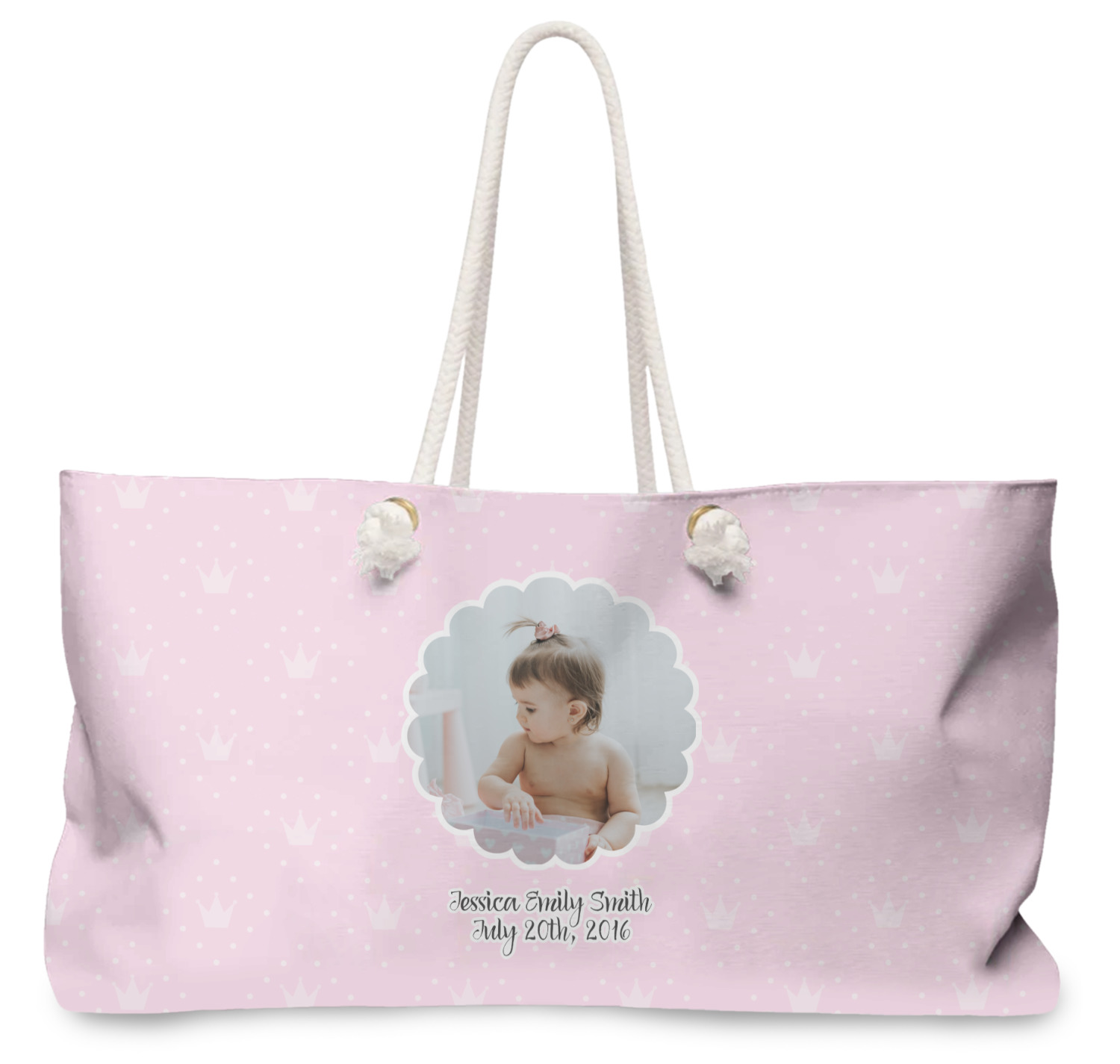 This design is for baby girls. The background is a baby pink background with crowns and polka dots. In the middle of the design is a scalloped frame to upload your baby's picture into (make sure it is high quality!). Underneath you are able to put personalized text with their birthday or whatever you like.