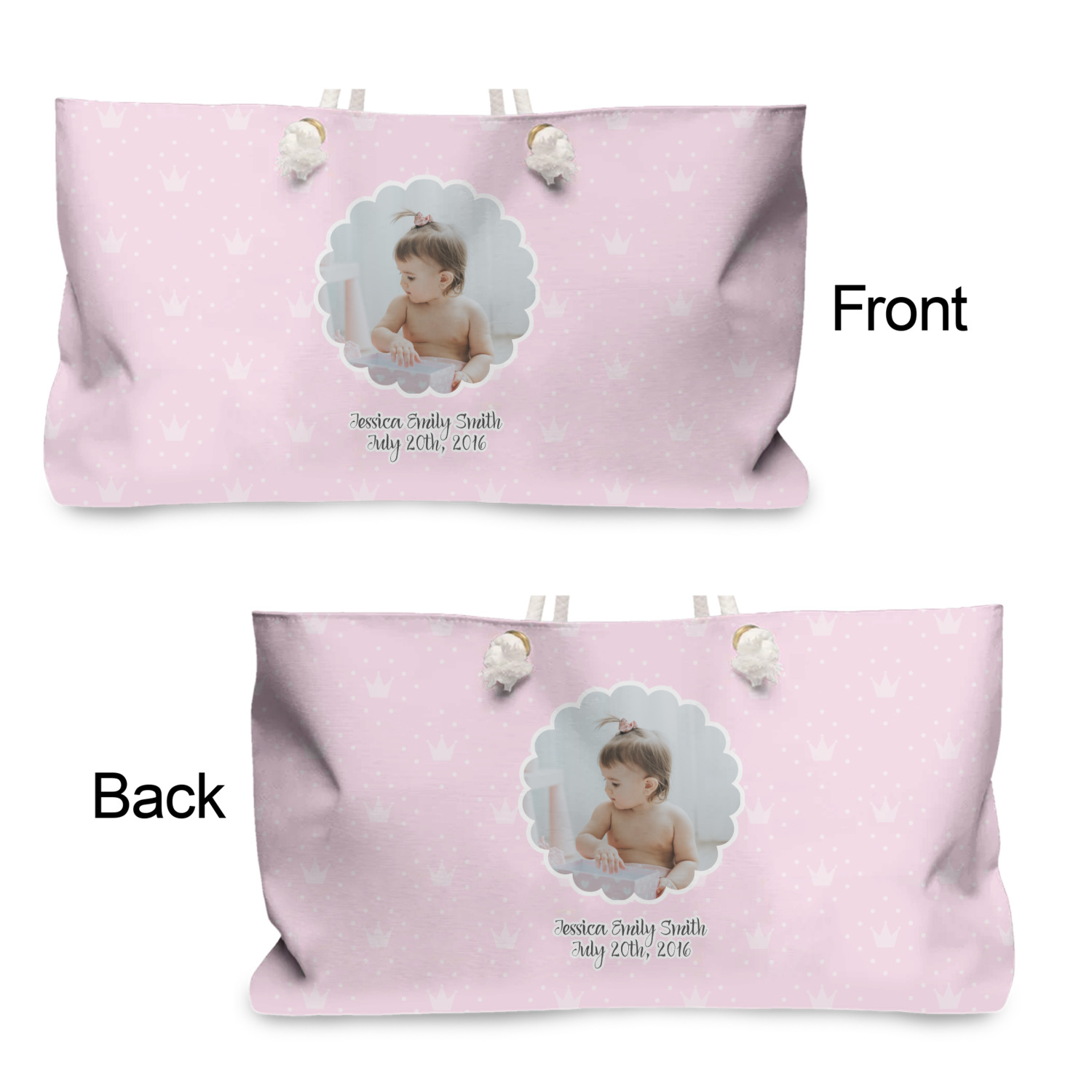 These weekender totes can be customized front and back. The totes are full all over print - so the choice of how background are endless - from beautiful floral or leaf patterns to geometrics or some classic Van Gogh artwork - the possibilities are endless. The totes can also be decorated with photos and logos.