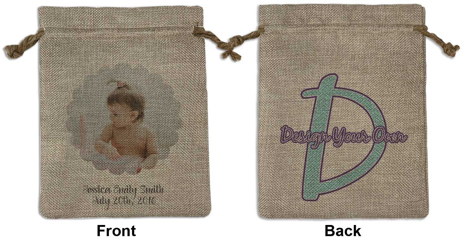 We sell our Burlap Gift Bags in 3 variant sized bags. Made with burlap polyester, each personalized bag can be secured with a twine drawstring pull. Your custom design is available to print on one side or both sides - completely up to you! The sizes of the bags measure approximately 4.5" x 6.5" for the smallest size, 6.5" x 8.0" for the medium size, and 6.5" x 13.5" for the large-sized bag.