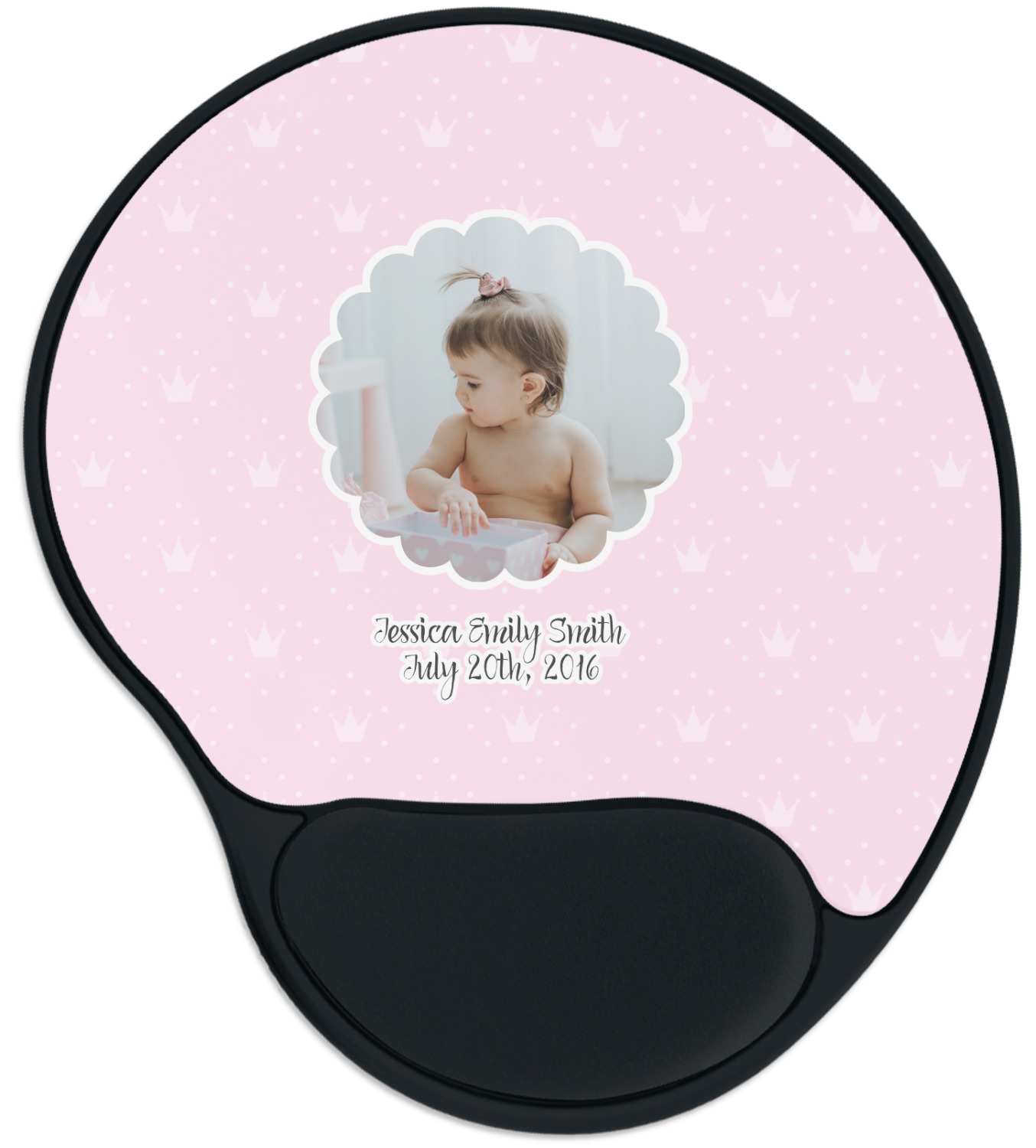 The top of these personalized mouse pads are made from a polyester, while the underside is plastic. The back of these mouse mats include rubber feet to prevent any slippage while in use. A padded wrist support, made from plush memory foam, occupies the bottom section of these computer mouse pads. Your customized design is printed onto the face of this mat, with the remaining sides and support piece colored in black. The mat itself is rounded and measures at 10.25" x 9.13".