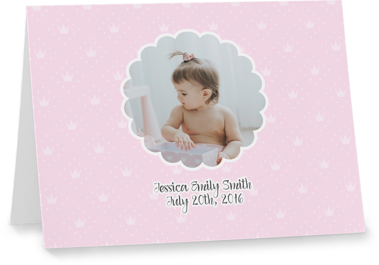 This design is for baby girls. The background is a baby pink background with crowns and polka dots. In the middle of the design is a scalloped frame to upload your baby's picture into (make sure it is high quality!). Underneath you are able to put personalized text with their birthday or whatever you like.