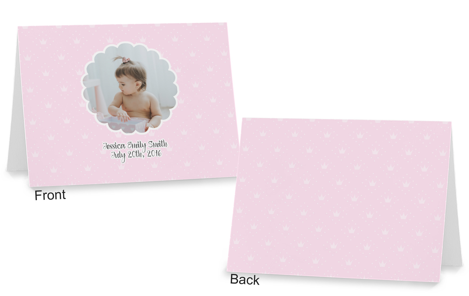 Our custom folded note cards are printed on premium 100lb. card stock and comes with white envelopes. The note card measure 5.5 by 4.25 inches and are blank on the inside for your handwritten message.