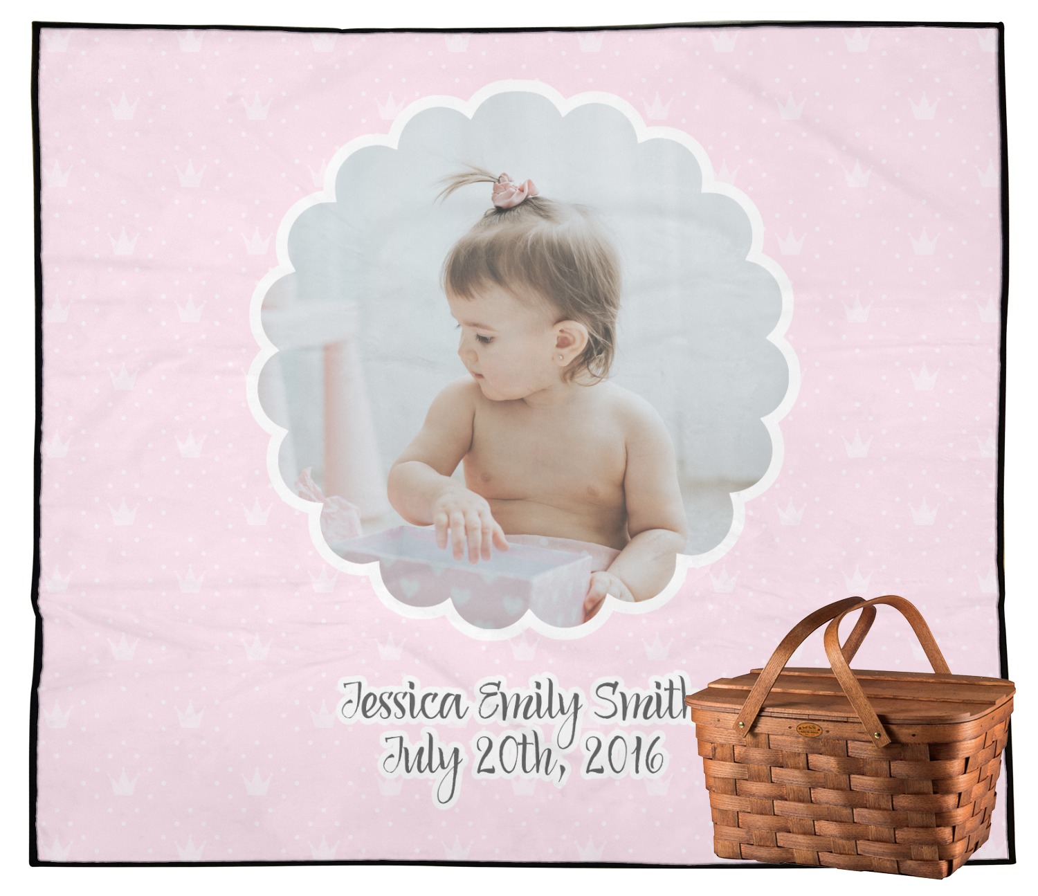 This design is for baby girls. The background is a baby pink background with crowns and polka dots. In the middle of the design is a scalloped frame to upload your baby's picture into (make sure it is high quality!). Underneath you are able to put personalized text with their birthday or whatever you like.