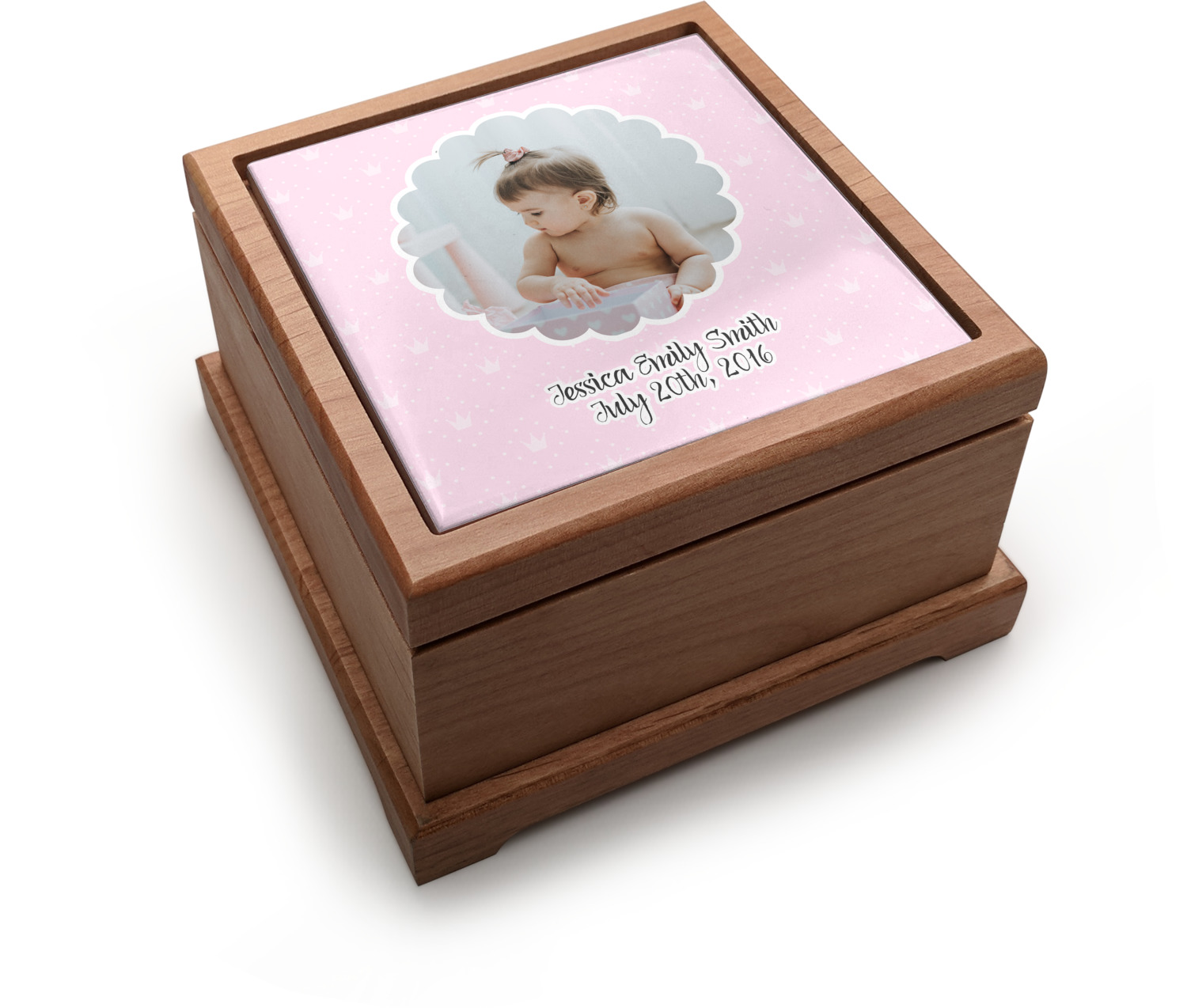 This design is for baby girls. The background is a baby pink background with crowns and polka dots. In the middle of the design is a scalloped frame to upload your baby's picture into (make sure it is high quality!). Underneath you are able to put personalized text with their birthday or whatever you like.