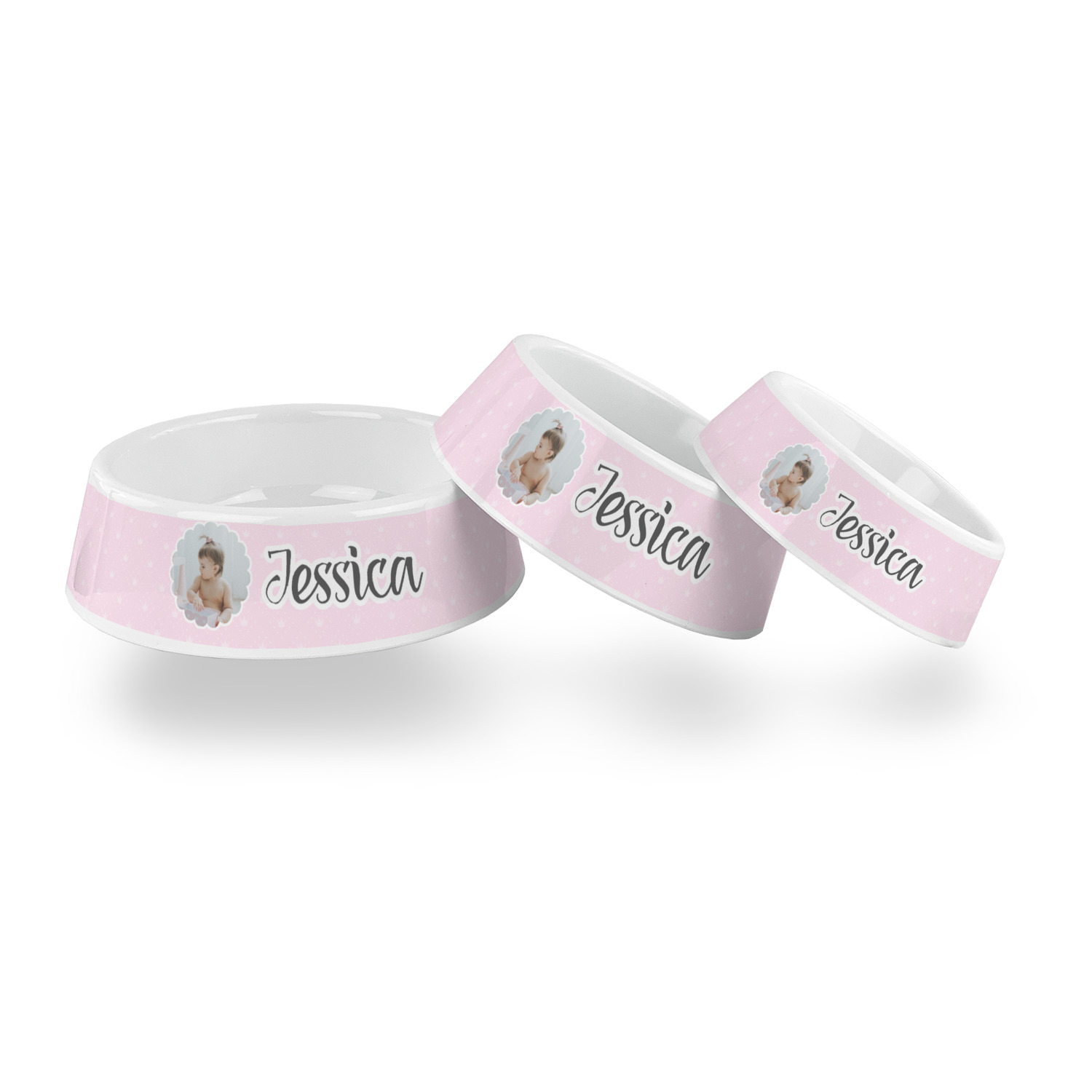 This design is for baby girls. The background is a baby pink background with crowns and polka dots. In the middle of the design is a scalloped frame to upload your baby's picture into (make sure it is high quality!). Underneath you are able to put personalized text with their birthday or whatever you like.