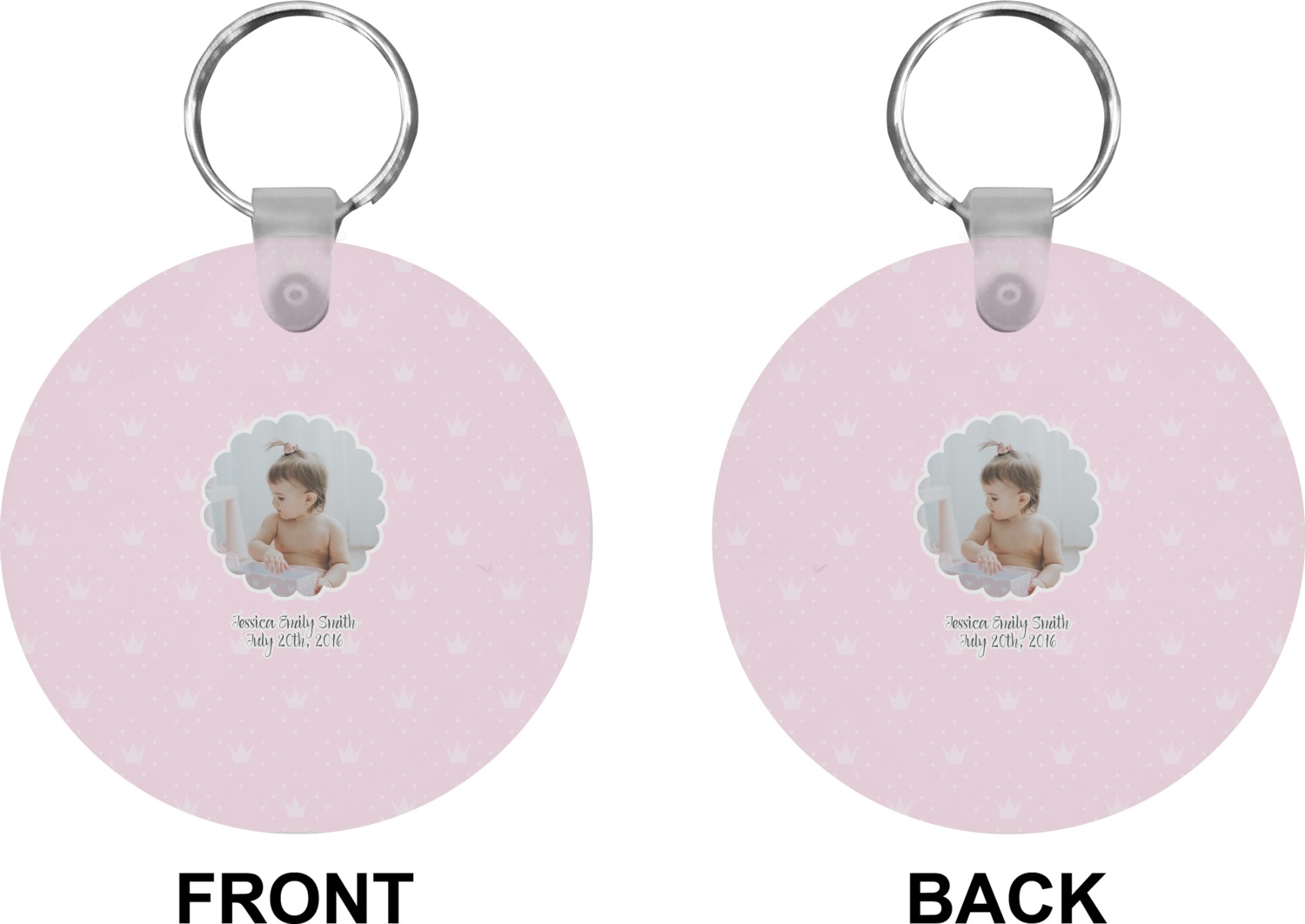 Our personalized keychains attach to the included metal, split key ring with a plastic, removable snap. Since a metal ring is included with your purchase, you have the liberty to keep your keys together on the ring, with or without your unique keychain. We offer this keychain in three different shapes: circle, heart, or diamond. We print your personalized design(s) on both sides of the key chain, and the surface has a glossy, reflective finish that only emphasizes your design. Each keychain is approximately 2.25 by 2.25 inches.