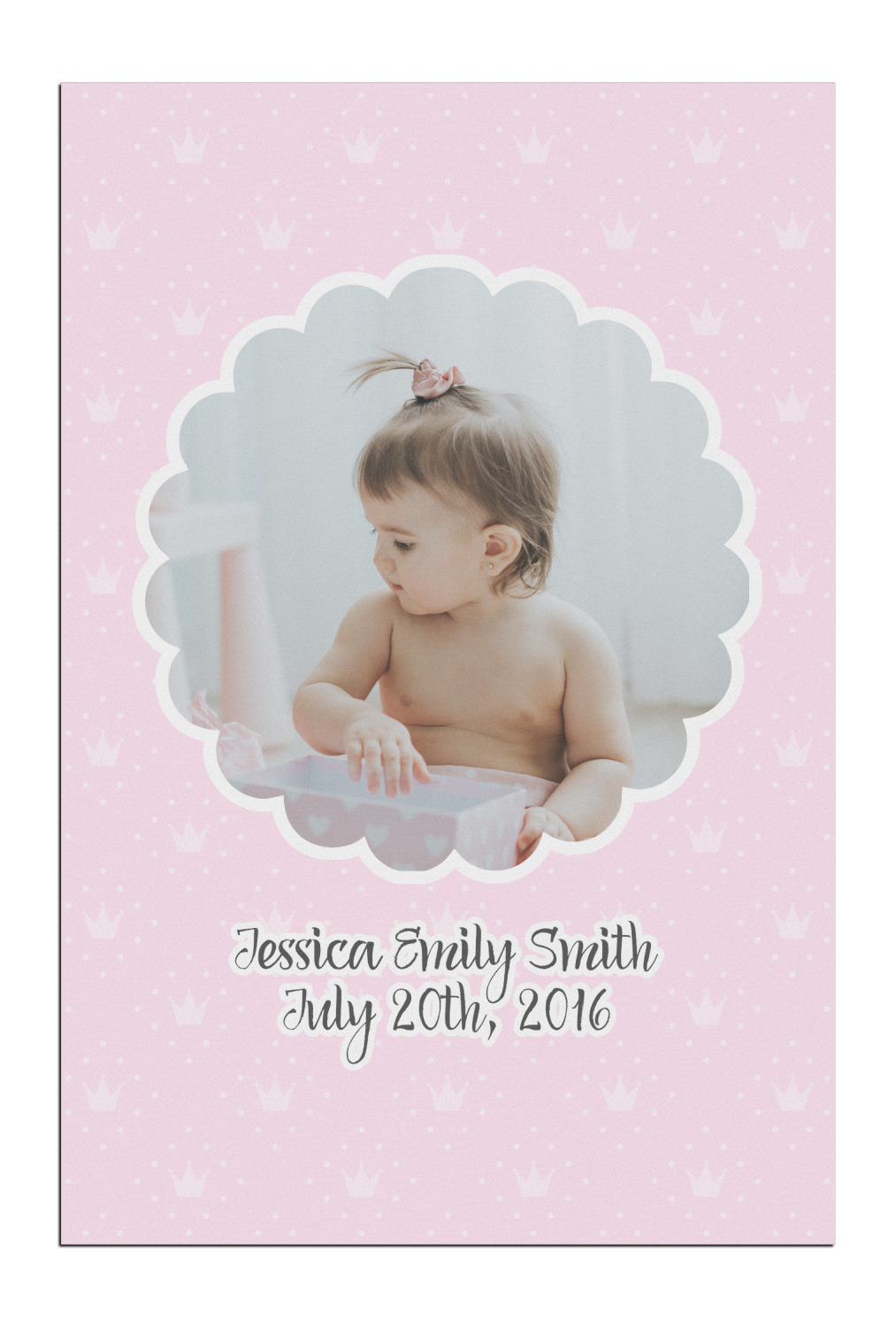 This design is for baby girls. The background is a baby pink background with crowns and polka dots. In the middle of the design is a scalloped frame to upload your baby's picture into (make sure it is high quality!). Underneath you are able to put personalized text with their birthday or whatever you like.