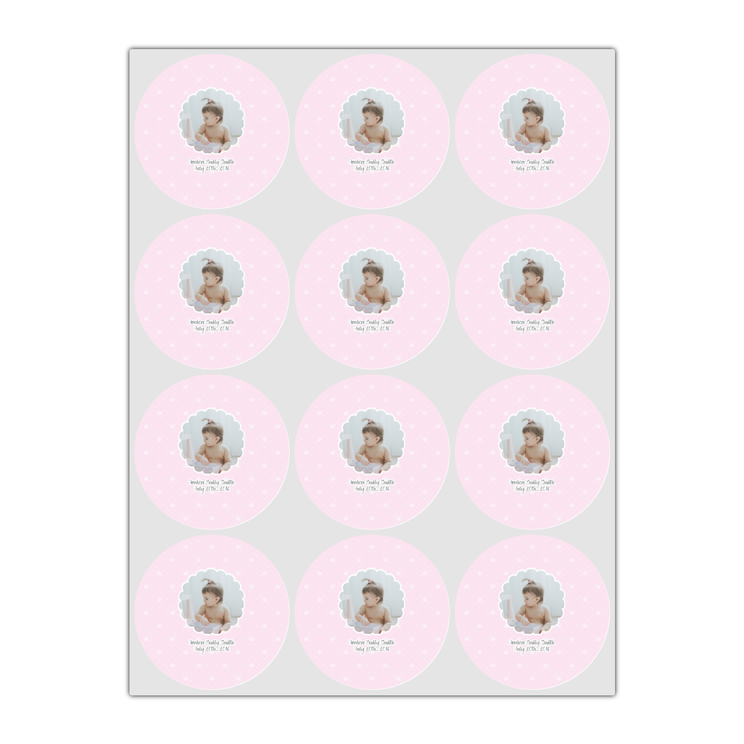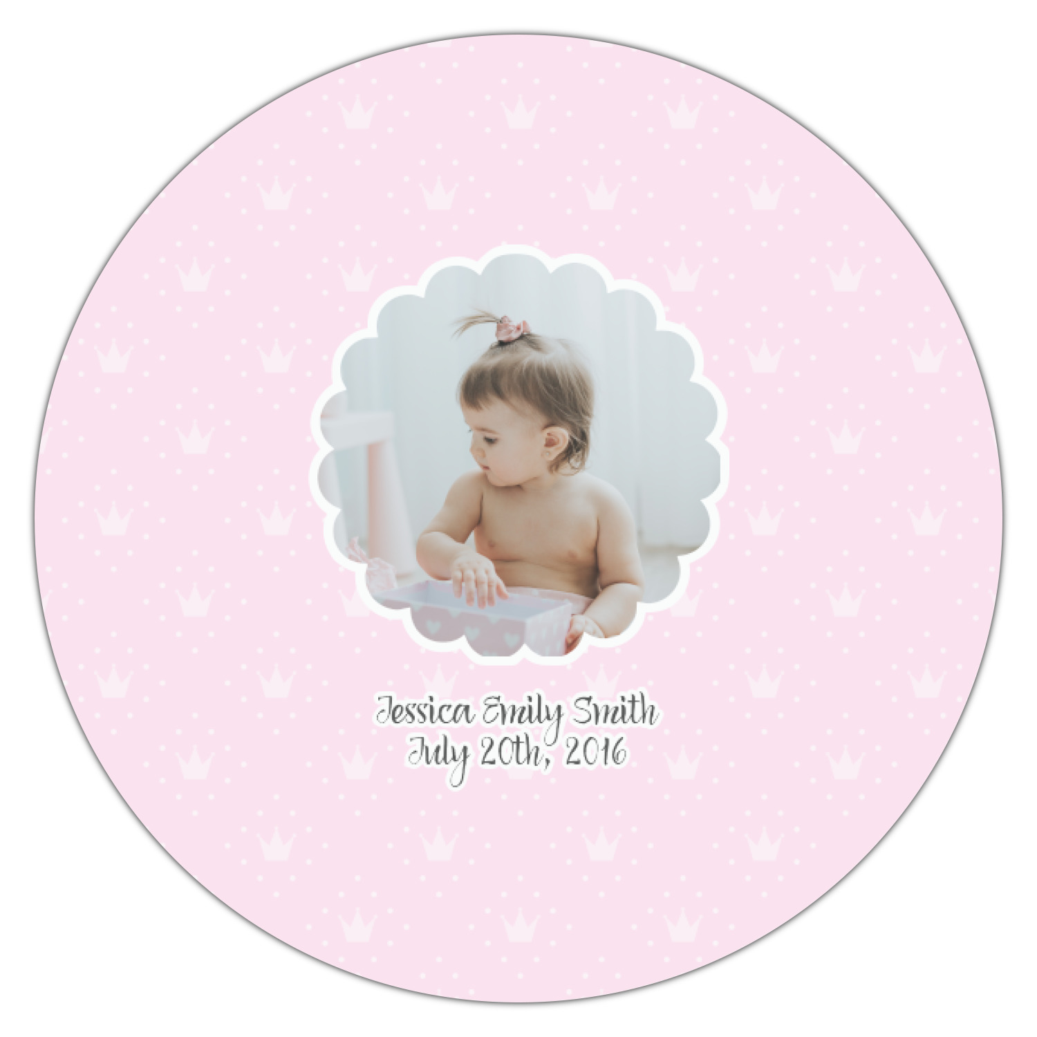 This design is for baby girls. The background is a baby pink background with crowns and polka dots. In the middle of the design is a scalloped frame to upload your baby's picture into (make sure it is high quality!). Underneath you are able to put personalized text with their birthday or whatever you like.
