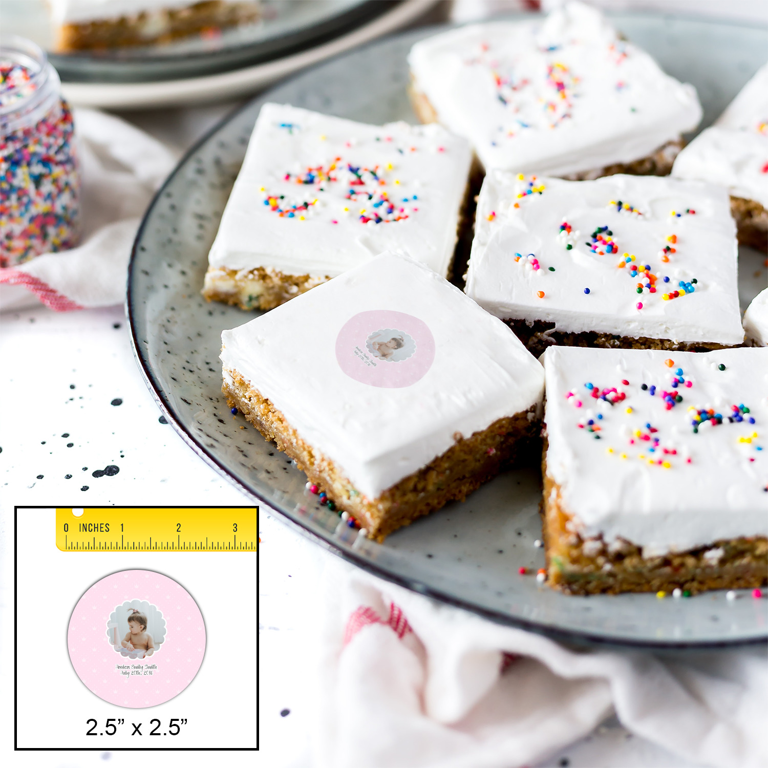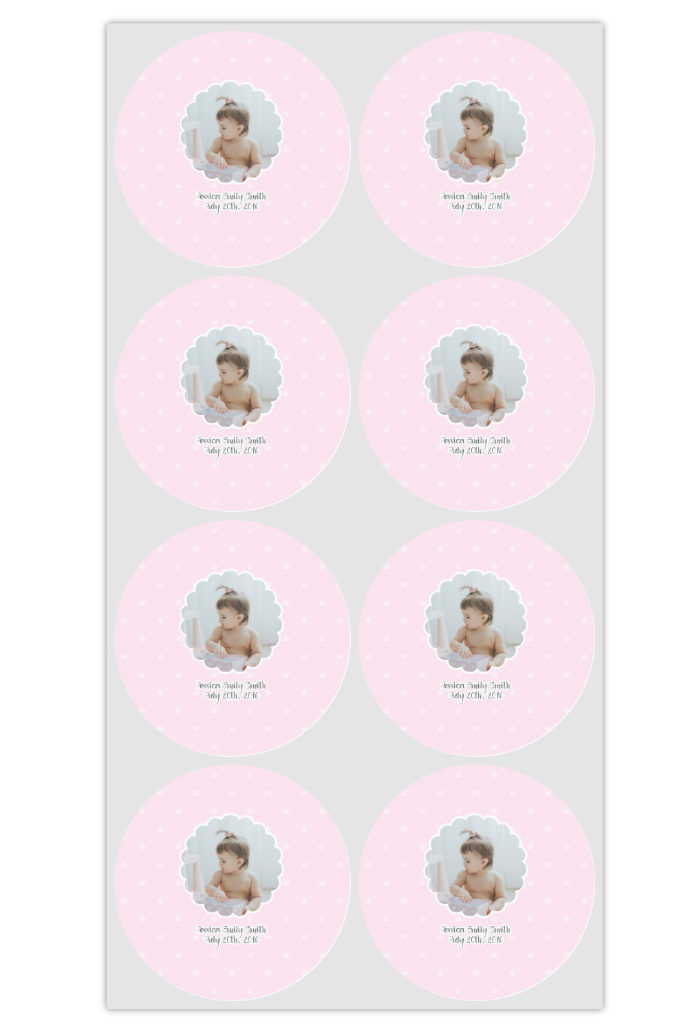 This design is for baby girls. The background is a baby pink background with crowns and polka dots. In the middle of the design is a scalloped frame to upload your baby's picture into (make sure it is high quality!). Underneath you are able to put personalized text with their birthday or whatever you like.