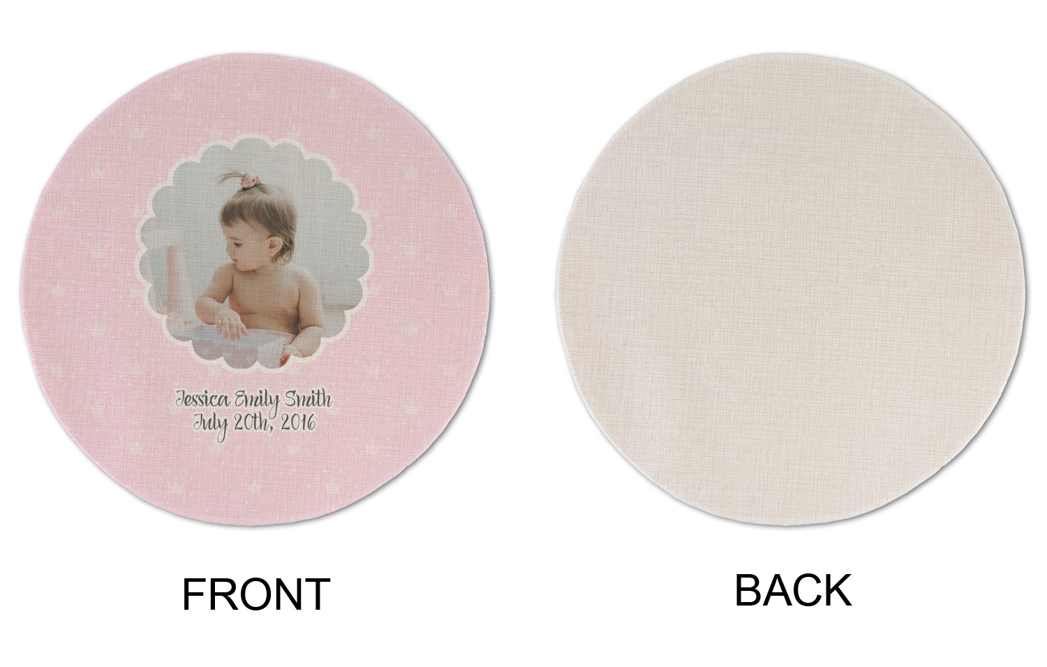 This design is for baby girls. The background is a baby pink background with crowns and polka dots. In the middle of the design is a scalloped frame to upload your baby's picture into (make sure it is high quality!). Underneath you are able to put personalized text with their birthday or whatever you like.