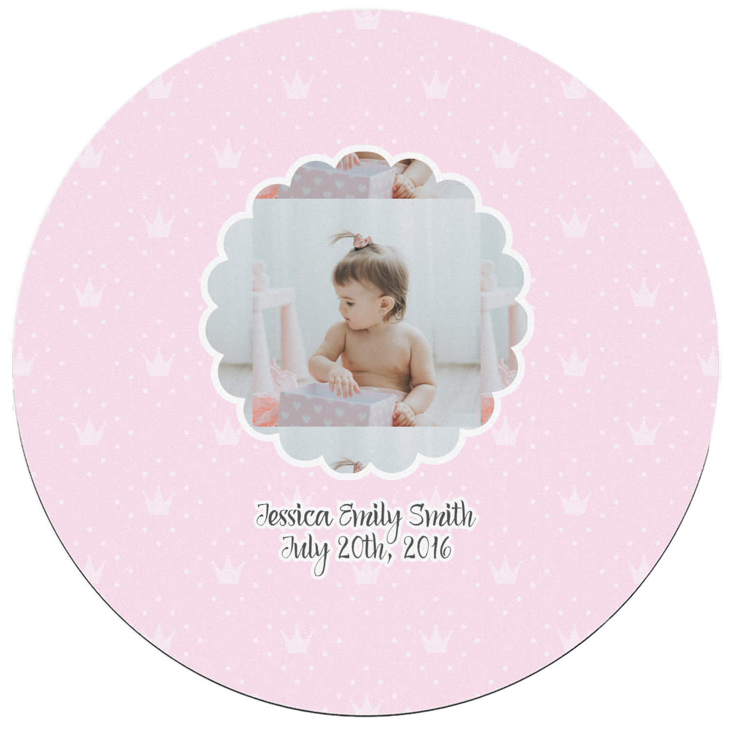 This design is for baby girls. The background is a baby pink background with crowns and polka dots. In the middle of the design is a scalloped frame to upload your baby's picture into (make sure it is high quality!). Underneath you are able to put personalized text with their birthday or whatever you like.