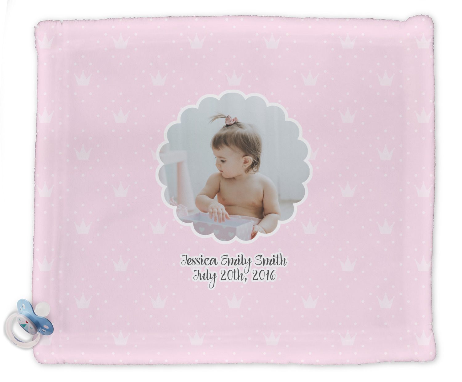 Crafted from an ultra soft fleece, these lovey blankets are the perfect, portable size to follow your child on any of his or her adventures. The plush texture also makes them ideal for naptime. Each personalized baby blanket measures at approximately 12 by 11 inches.
