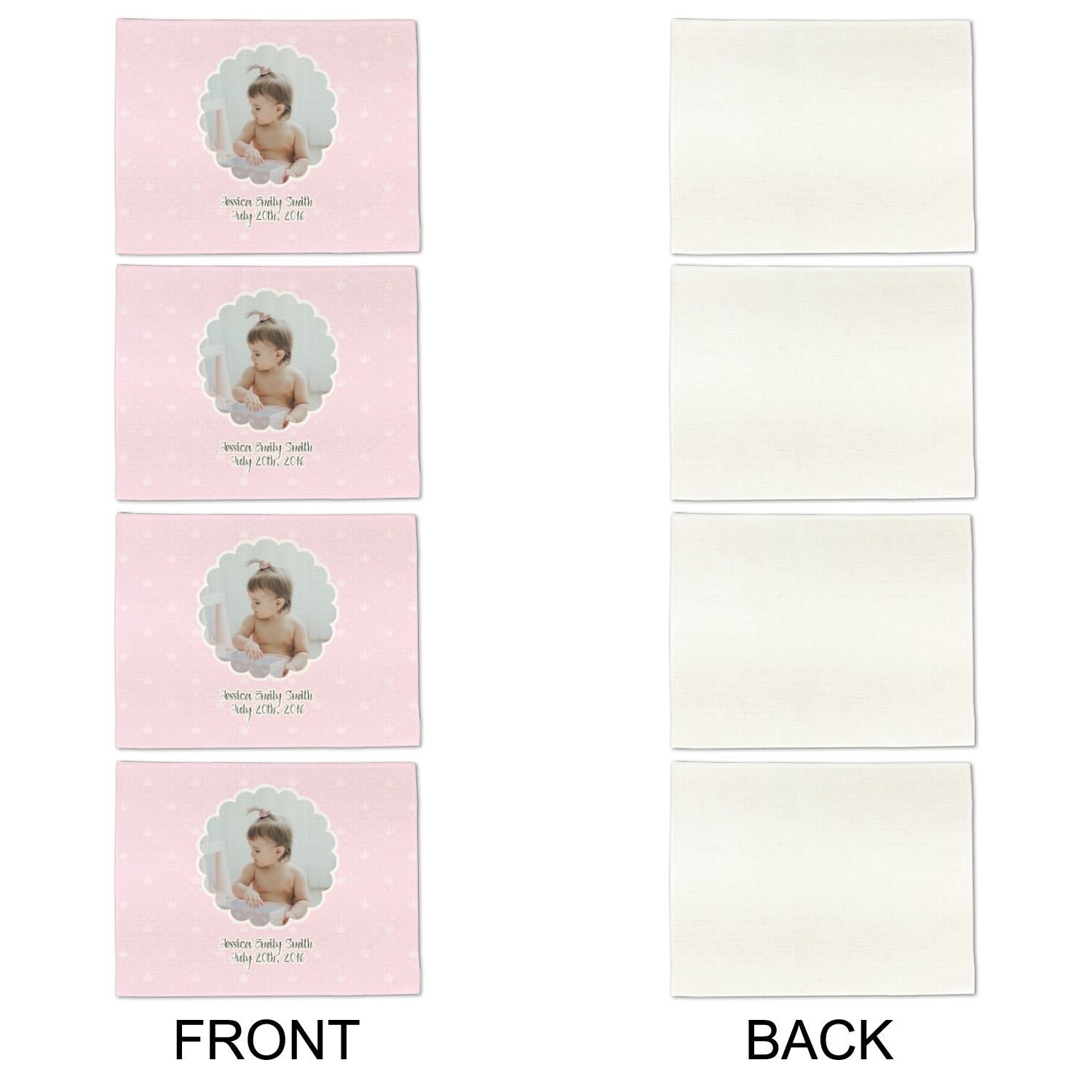 This design is for baby girls. The background is a baby pink background with crowns and polka dots. In the middle of the design is a scalloped frame to upload your baby's picture into (make sure it is high quality!). Underneath you are able to put personalized text with their birthday or whatever you like.