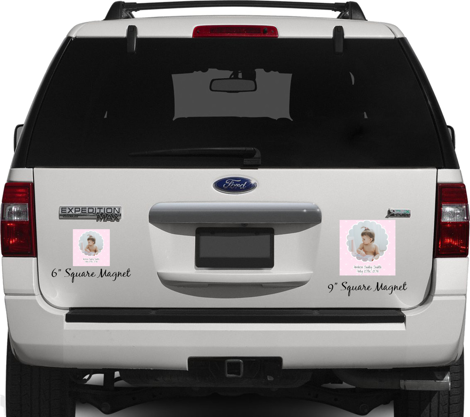 Your personalized car magnets are available for purchase in two shapes and two sizes. We carry round and square editions; each shape can either be 6 by 6 inches, or 10 by 10 inches, depending on your needs. Both versions are 1 millimeter thick, which is considered, within the industry, as the ideal thickness for automobile magnets. The magnetic car decals will adhere to any smooth, metal surface of your cars body, such as the trunk door or a side panel. However, please note that some vehicles are constructed from fiberglass bodies, which prevents the adhesion of anything magnetic. We advise that you test your vehicle before purchasing these magnets.