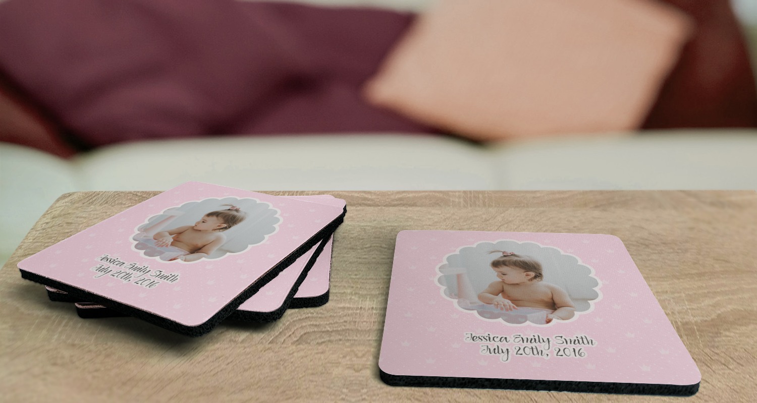 These drink coasters have a smooth, polyester top and a textured, rubber backing on its bottom. The non-slip rubber backing underneath works to keep any spills at bay. At 4 by 4 by 0.25 inches thick, these custom coasters are a suitable size for most drinkware. Your personalization is displayed atop the face of the cup coaster. We sell these rubber coasters in two different shapes: square and round. You can buy each shape as singulars or as a set of 4.