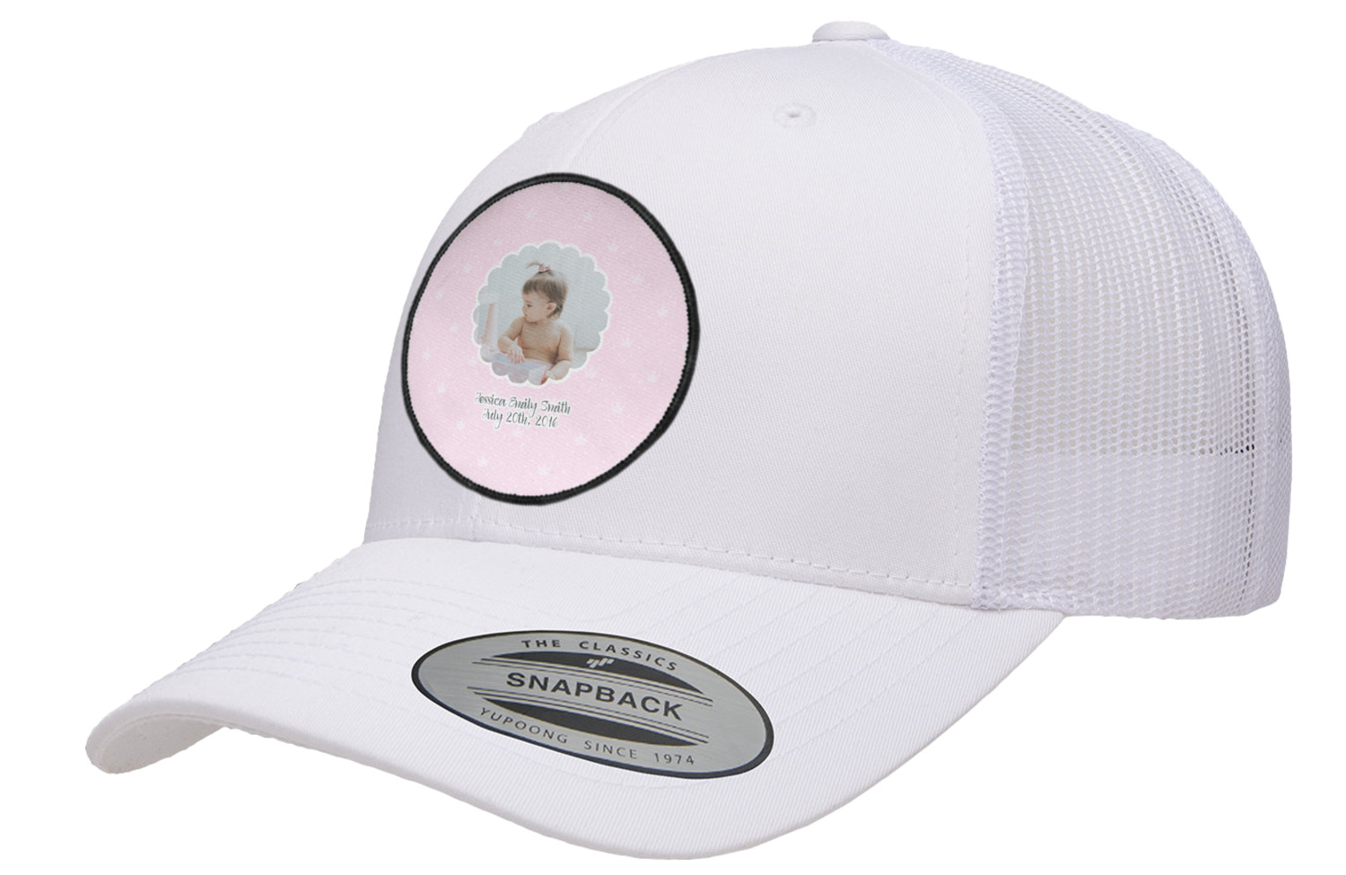 This design is for baby girls. The background is a baby pink background with crowns and polka dots. In the middle of the design is a scalloped frame to upload your baby's picture into (make sure it is high quality!). Underneath you are able to put personalized text with their birthday or whatever you like.