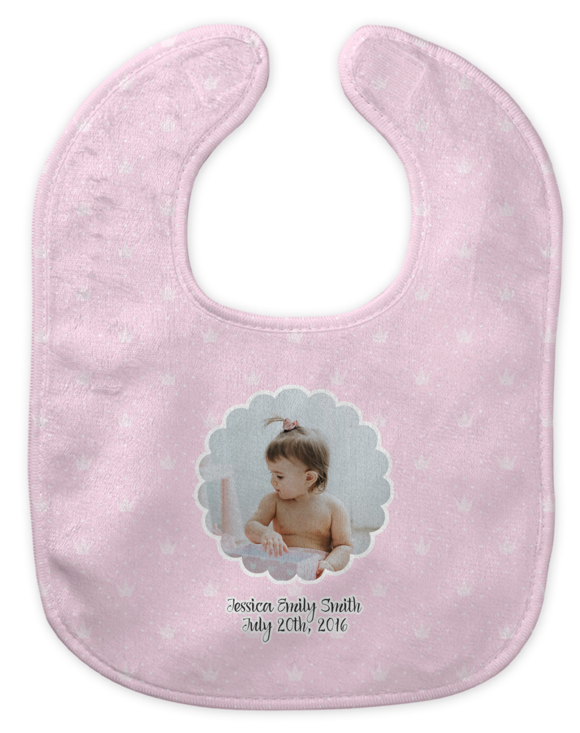 Made of soft polyester, each customizable bib hugs comfortably around the neck to catch every drip and drool. Each bib design is printed with baby-safe ink and finished with a secure stitch pattern and velcro clasp. We carry two customizable bib styles -Microfiber Velour and Jersey Knit.