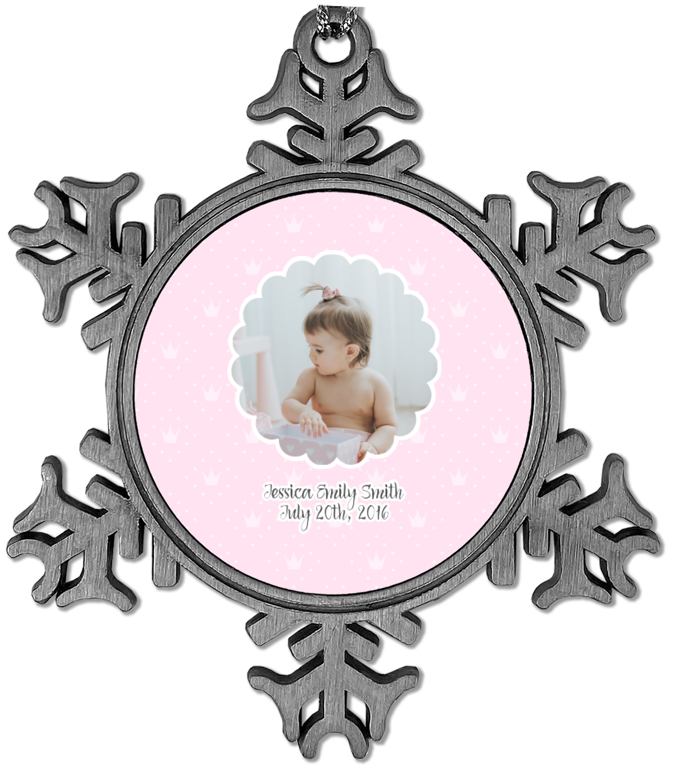 The snowflake shape ornament is an everlasting pewter material with a circular center to display your photo or design, giving it a unique vintage ornament look. Our personalized Christmas ornament comes in a small gift box for keepsake sure to preserve your picture ornament until the next holiday season. The snowflake shape is approximately 3 x 3 with a small silver accent string perfect for hanging. We print your photo or design in the center of the ornament with a size that is roughly 1.75 in diameter.