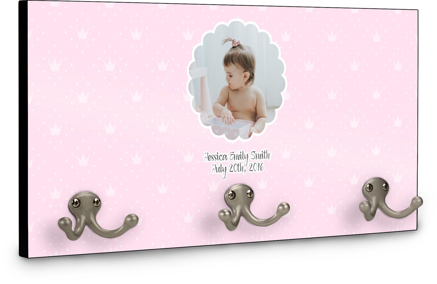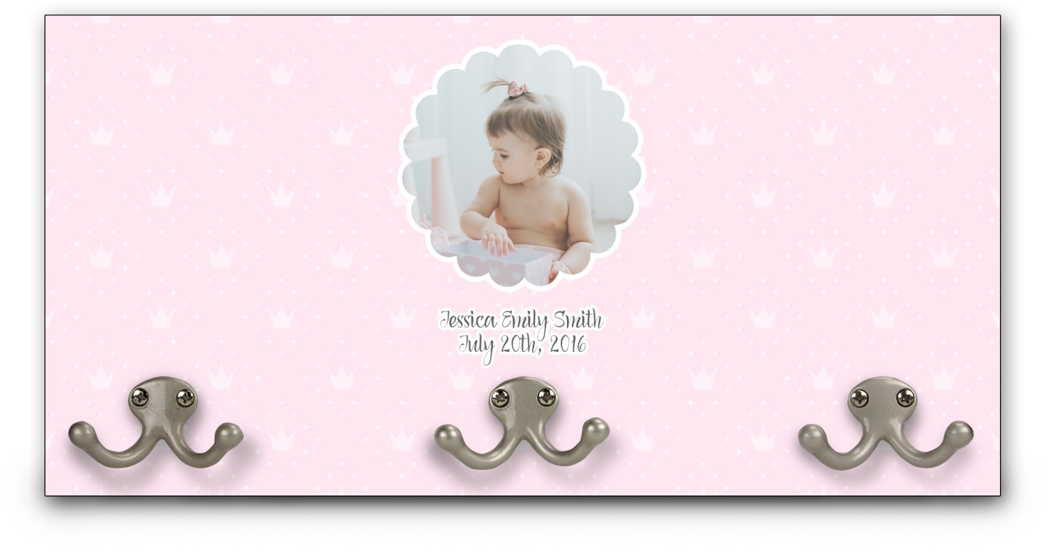 This coat rack is the perfect way to add some personality to your wall or entryway. The board is made of a strong maple that is approximately 16" x 8". The three 2-prong hooks are a sturdy metal that have three screws attaching them to the board. Your design is printed right onto the front of the board while the back and sides are a simple black.