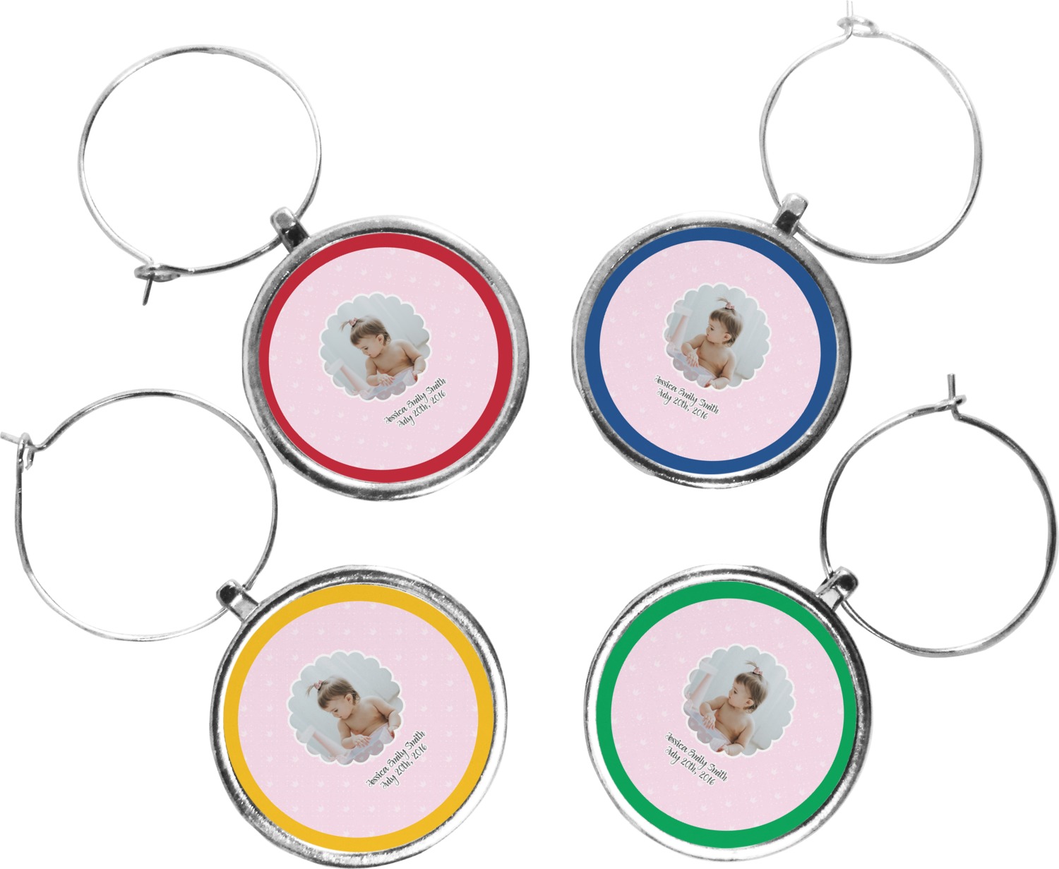 Your wine glass markers are comprised of a circular zinc plate with a 1.25 inch diameter. The zinc plate hangs from a zinc loop, which can be easily secured and removed from the stem of a wine glass. Your customized design is printed onto a 1 inch diameter insert, and then placed into the wine glass charm itself. Though sold in a set of four, you can personalize each charm individually and change the colors of the ring around your design, depending on your needs.
