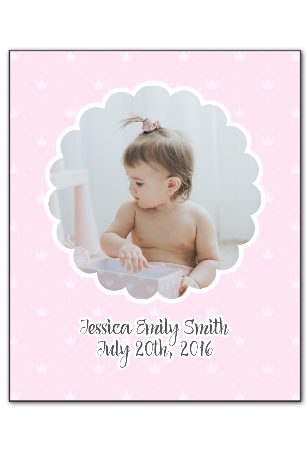 This design is for baby girls. The background is a baby pink background with crowns and polka dots. In the middle of the design is a scalloped frame to upload your baby's picture into (make sure it is high quality!). Underneath you are able to put personalized text with their birthday or whatever you like.