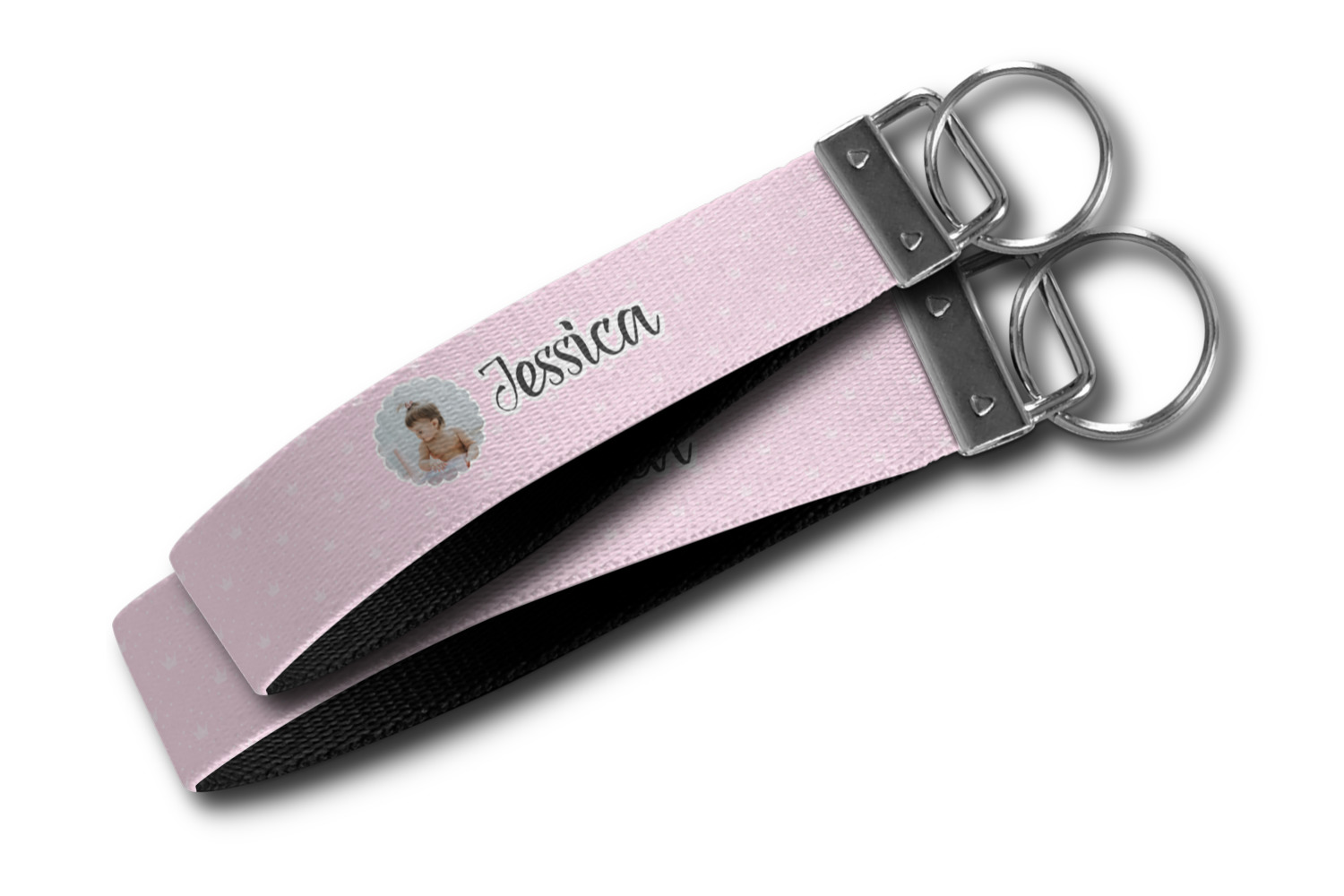 These key fob keychains are made from a polyester weave, right here in the USA. They feature a silver, metal clasp, attached to a round keyring. The piece gives the personalized wristlet a beautiful, finished look. Your customized design is printed on the outside of the keychain strap. We carry these wristlets in two sizes: small, which is 5 inches in width, and large, which is 5.5 inches in width.