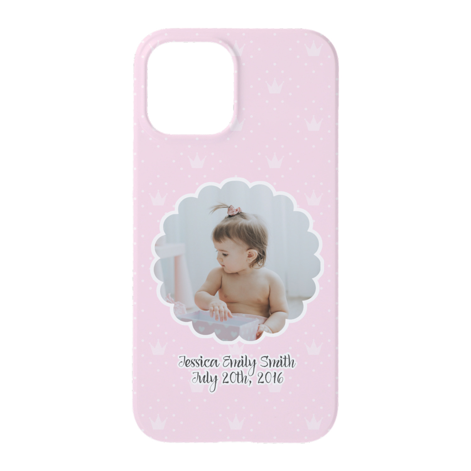 This design is for baby girls. The background is a baby pink background with crowns and polka dots. In the middle of the design is a scalloped frame to upload your baby's picture into (make sure it is high quality!). Underneath you are able to put personalized text with their birthday or whatever you like.