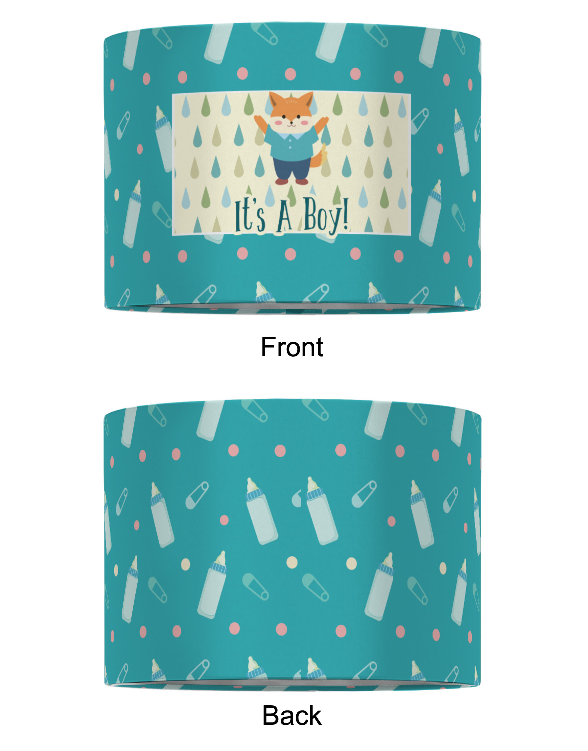 This design is for a new baby boy. The background is a bright teal color with baby bottles and safety pins. The secondary background has blue, teal, and green raindrops with a soft yellow behind them. The teal background almost acts as a frame around the yellow background. On the yellow background there is a fun little fox graphic celebrating with the words underneath him: "It's A Boy!"