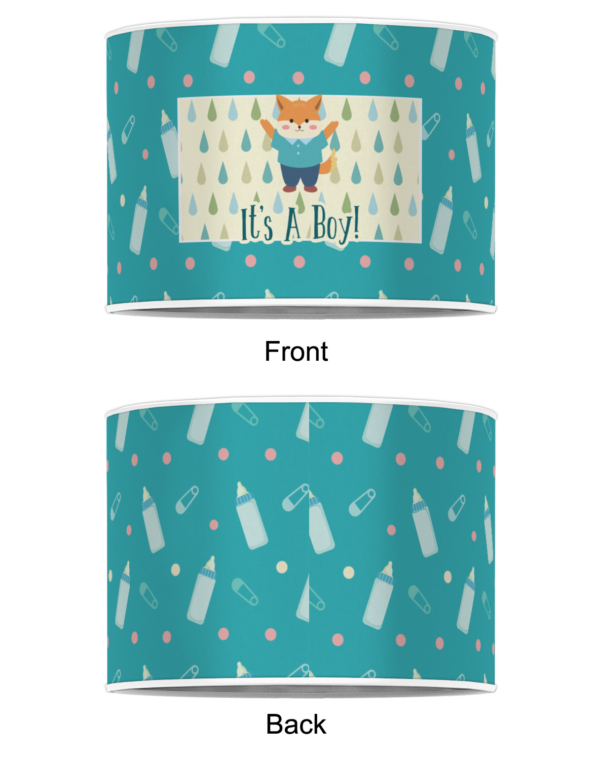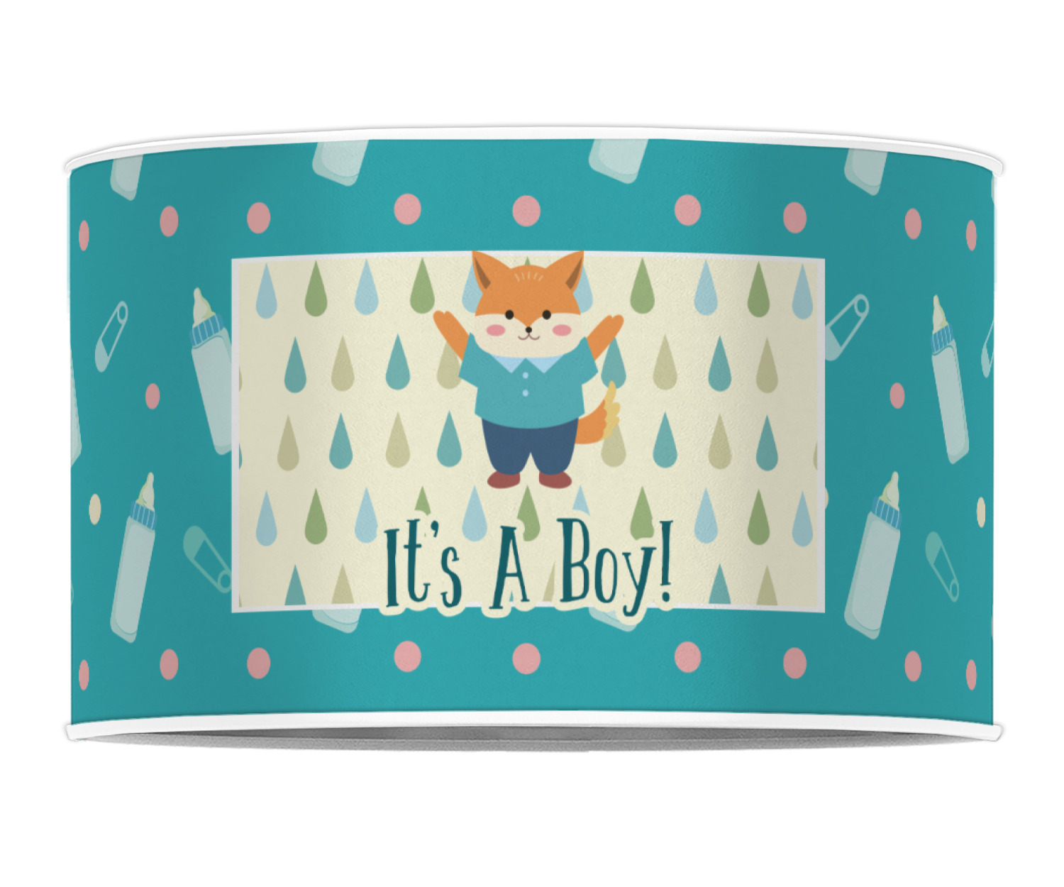 This design is for a new baby boy. The background is a bright teal color with baby bottles and safety pins. The secondary background has blue, teal, and green raindrops with a soft yellow behind them. The teal background almost acts as a frame around the yellow background. On the yellow background there is a fun little fox graphic celebrating with the words underneath him: "It's A Boy!"