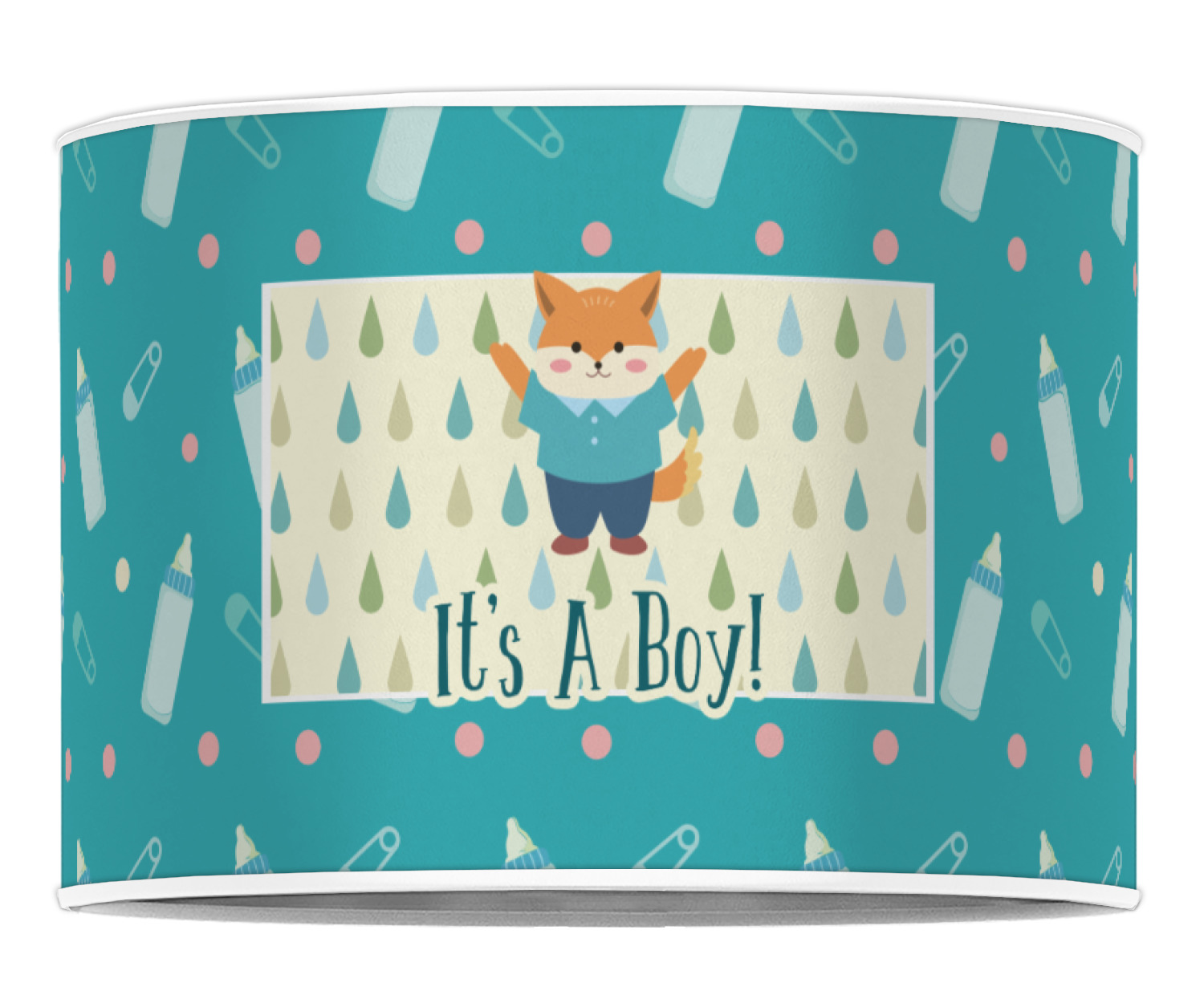 This design is for a new baby boy. The background is a bright teal color with baby bottles and safety pins. The secondary background has blue, teal, and green raindrops with a soft yellow behind them. The teal background almost acts as a frame around the yellow background. On the yellow background there is a fun little fox graphic celebrating with the words underneath him: "It's A Boy!"