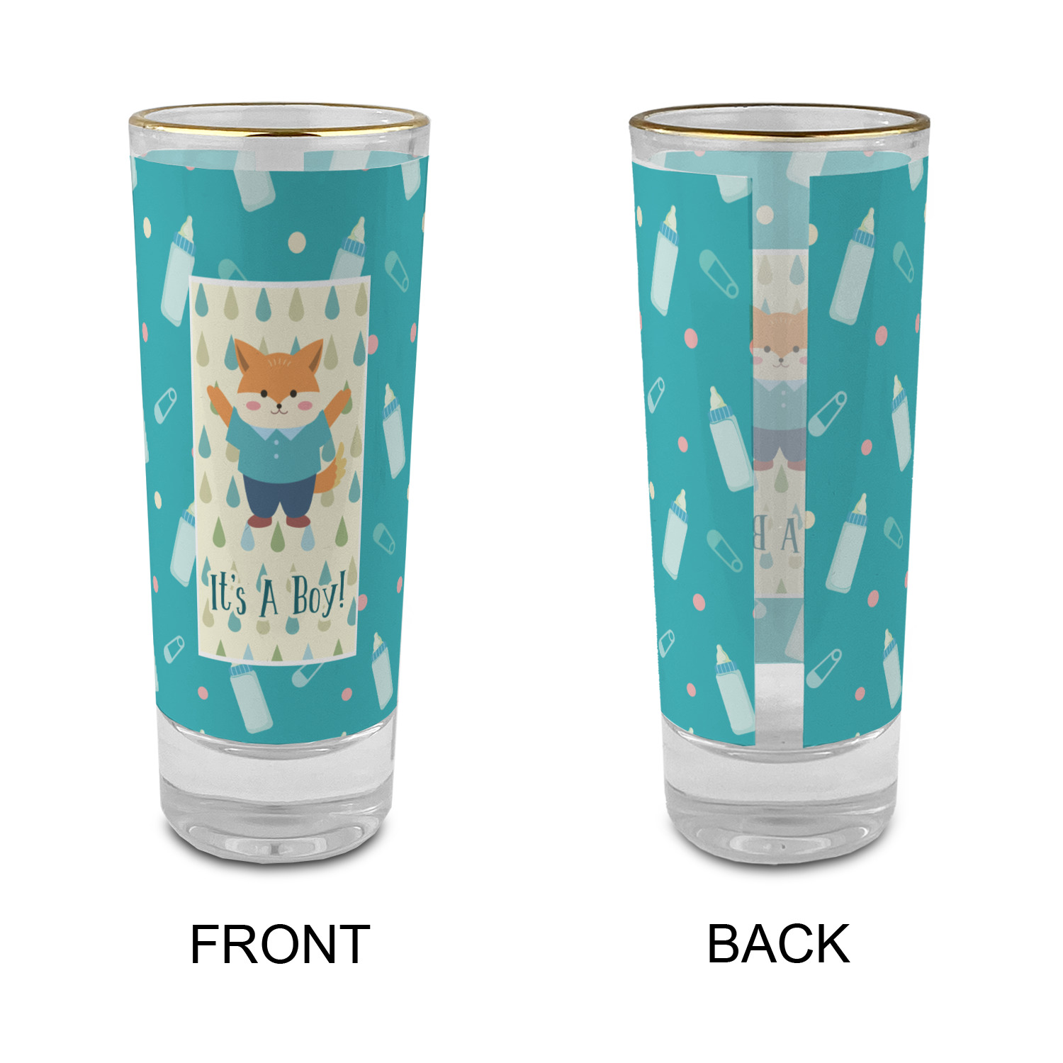 These glass shooter glasses are printed in full color with the design of your choice. These are a tall shooter 2 oz size and stand 4" tall. The print is a full wrap design to boldly display your personalization.