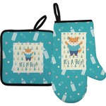This design is for a new baby boy. The background is a bright teal color with baby bottles and safety pins. The secondary background has blue, teal, and green raindrops with a soft yellow behind them. The teal background almost acts as a frame around the yellow background. On the yellow background there is a fun little fox graphic celebrating with the words underneath him: "It's A Boy!"