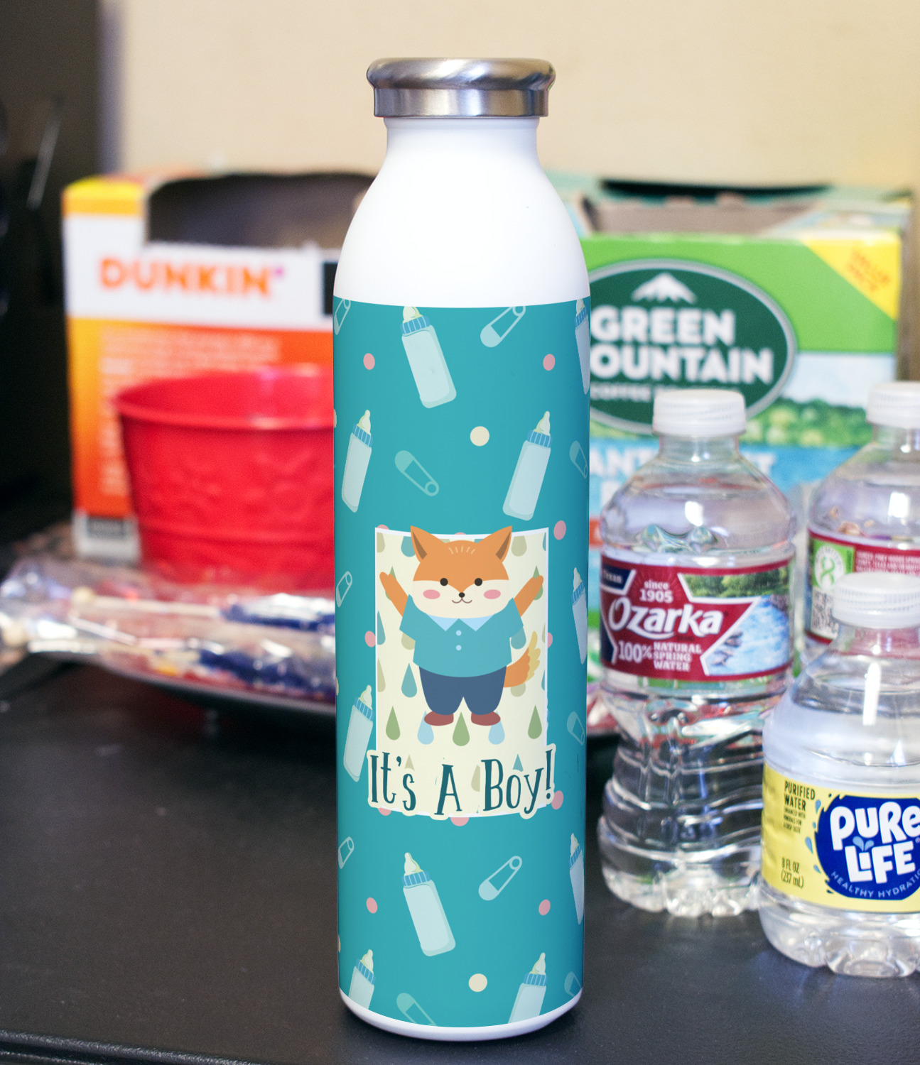 This design is for a new baby boy. The background is a bright teal color with baby bottles and safety pins. The secondary background has blue, teal, and green raindrops with a soft yellow behind them. The teal background almost acts as a frame around the yellow background. On the yellow background there is a fun little fox graphic celebrating with the words underneath him: "It's A Boy!"