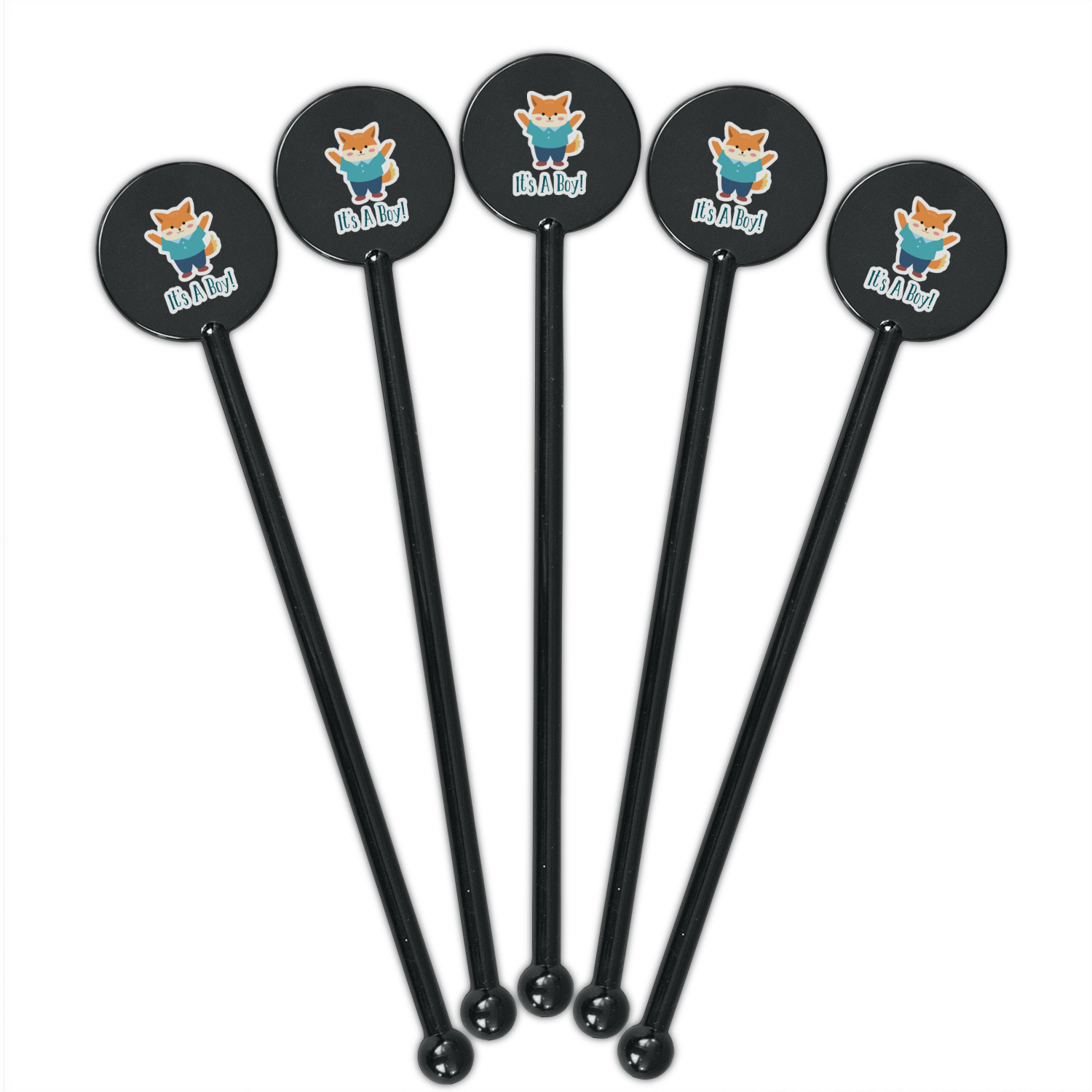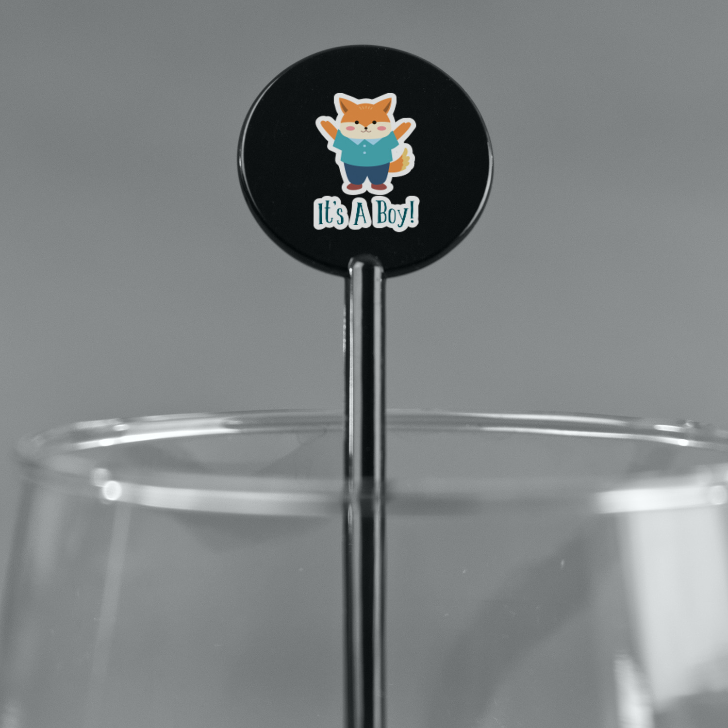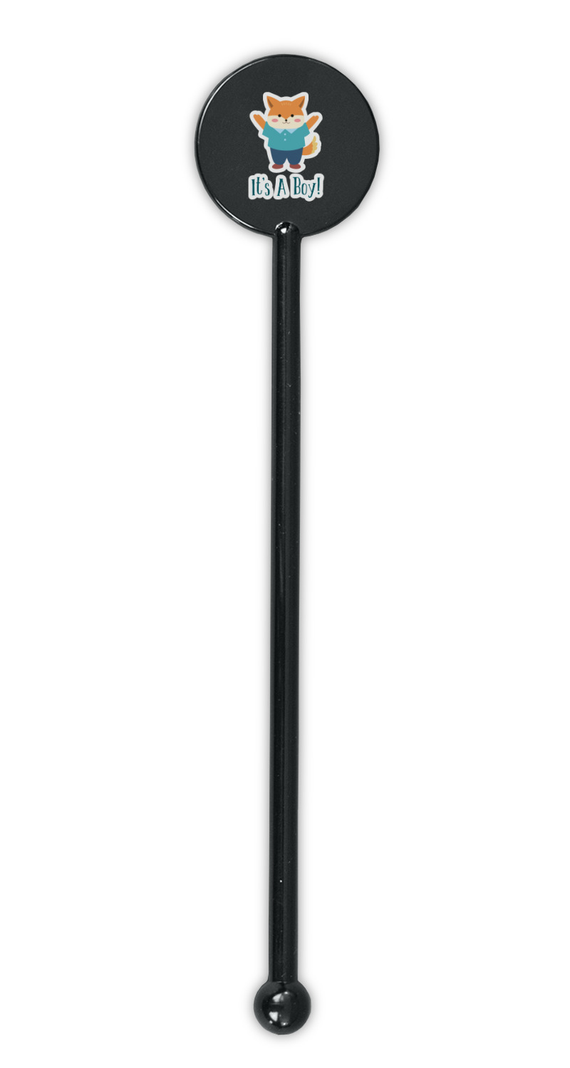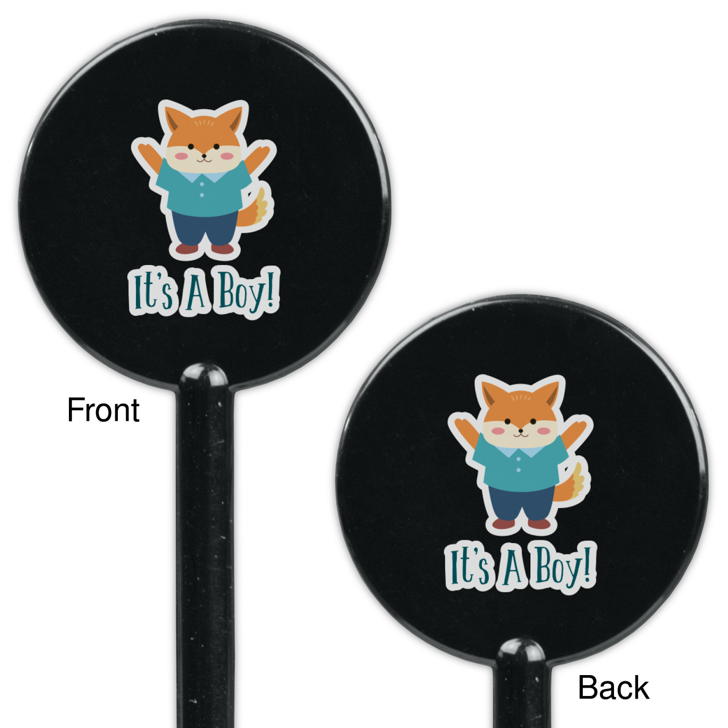 This design is for a new baby boy. The background is a bright teal color with baby bottles and safety pins. The secondary background has blue, teal, and green raindrops with a soft yellow behind them. The teal background almost acts as a frame around the yellow background. On the yellow background there is a fun little fox graphic celebrating with the words underneath him: "It's A Boy!"