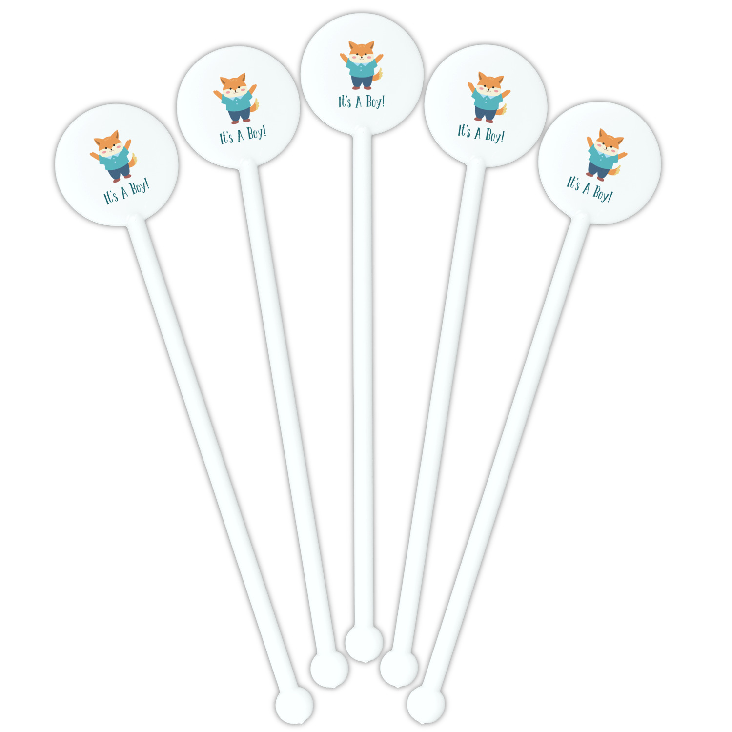 This design is for a new baby boy. The background is a bright teal color with baby bottles and safety pins. The secondary background has blue, teal, and green raindrops with a soft yellow behind them. The teal background almost acts as a frame around the yellow background. On the yellow background there is a fun little fox graphic celebrating with the words underneath him: "It's A Boy!"