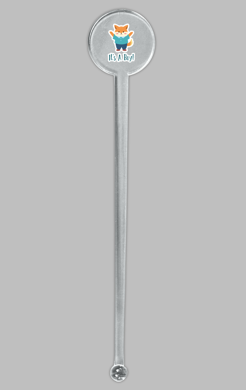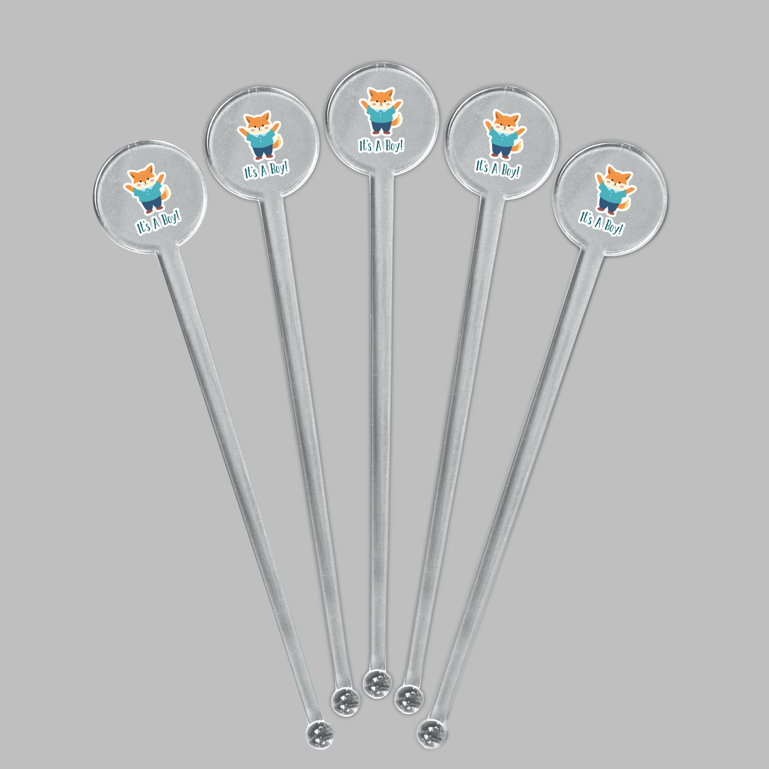 This design is for a new baby boy. The background is a bright teal color with baby bottles and safety pins. The secondary background has blue, teal, and green raindrops with a soft yellow behind them. The teal background almost acts as a frame around the yellow background. On the yellow background there is a fun little fox graphic celebrating with the words underneath him: "It's A Boy!"