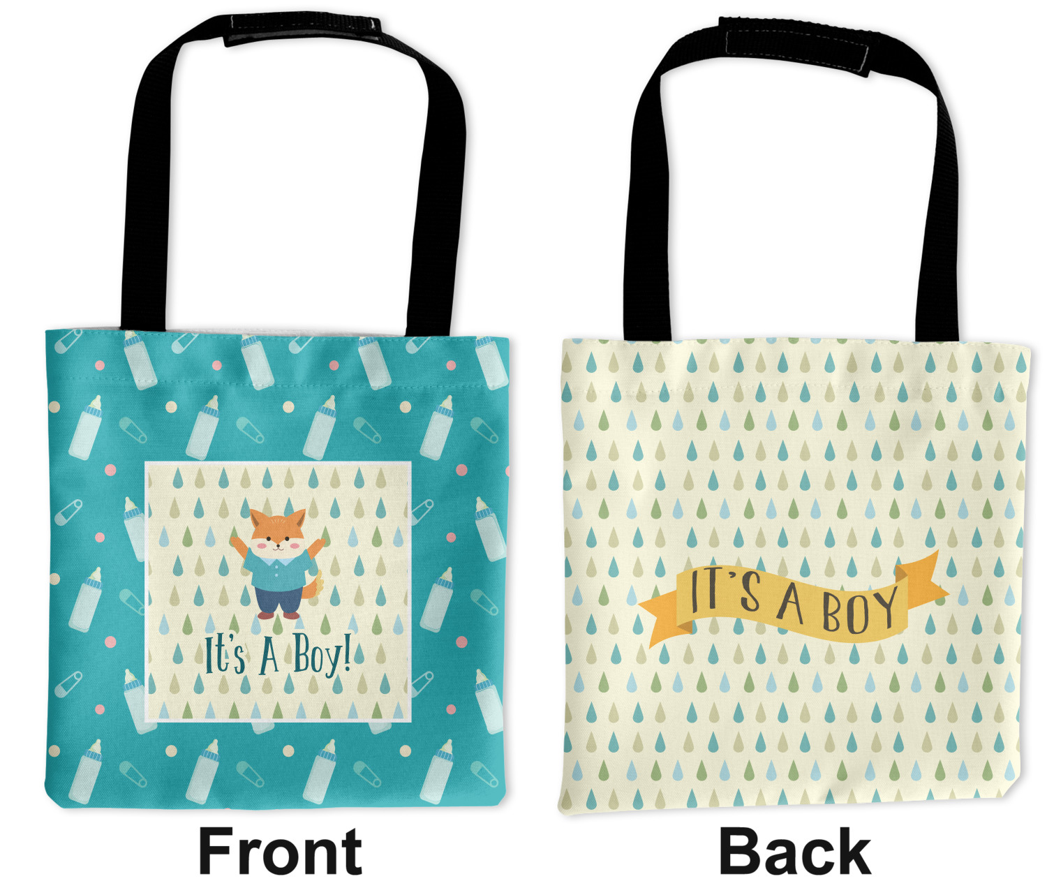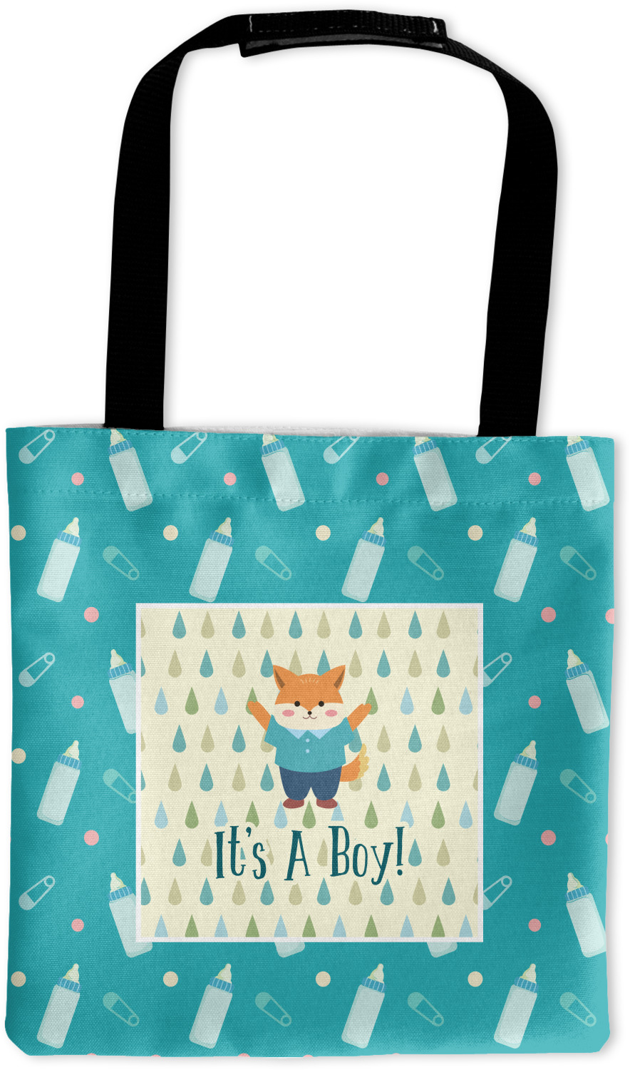 This design is for a new baby boy. The background is a bright teal color with baby bottles and safety pins. The secondary background has blue, teal, and green raindrops with a soft yellow behind them. The teal background almost acts as a frame around the yellow background. On the yellow background there is a fun little fox graphic celebrating with the words underneath him: "It's A Boy!"
