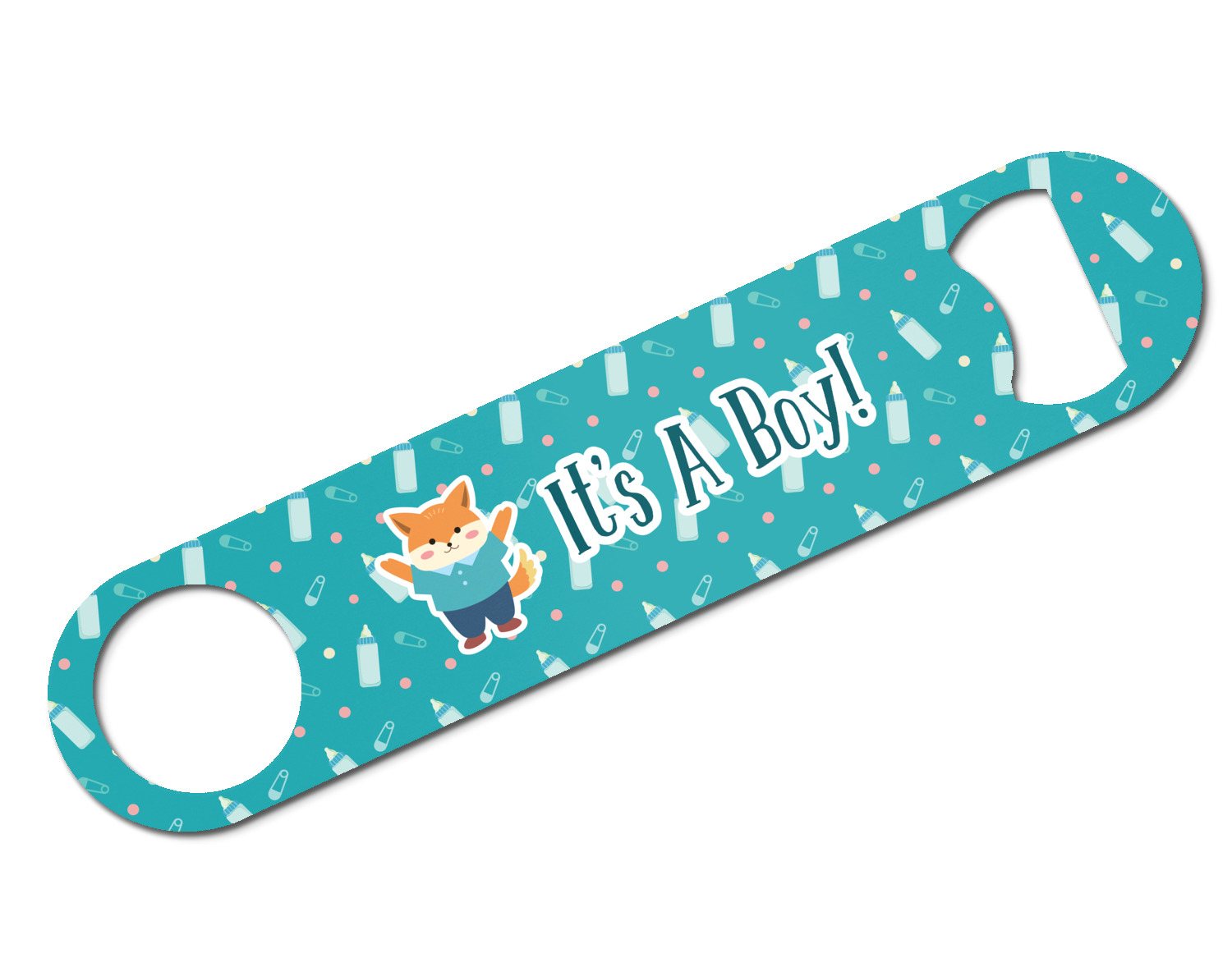 This design is for a new baby boy. The background is a bright teal color with baby bottles and safety pins. The secondary background has blue, teal, and green raindrops with a soft yellow behind them. The teal background almost acts as a frame around the yellow background. On the yellow background there is a fun little fox graphic celebrating with the words underneath him: "It's A Boy!"