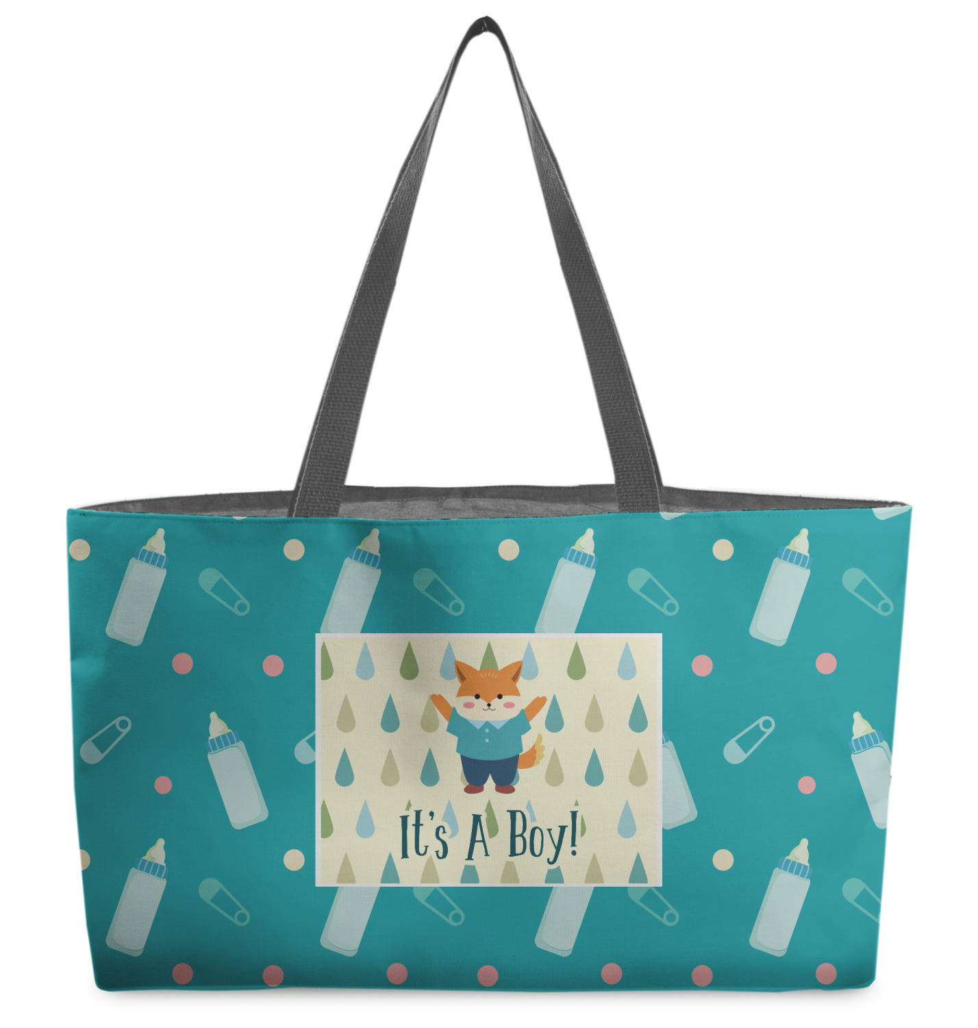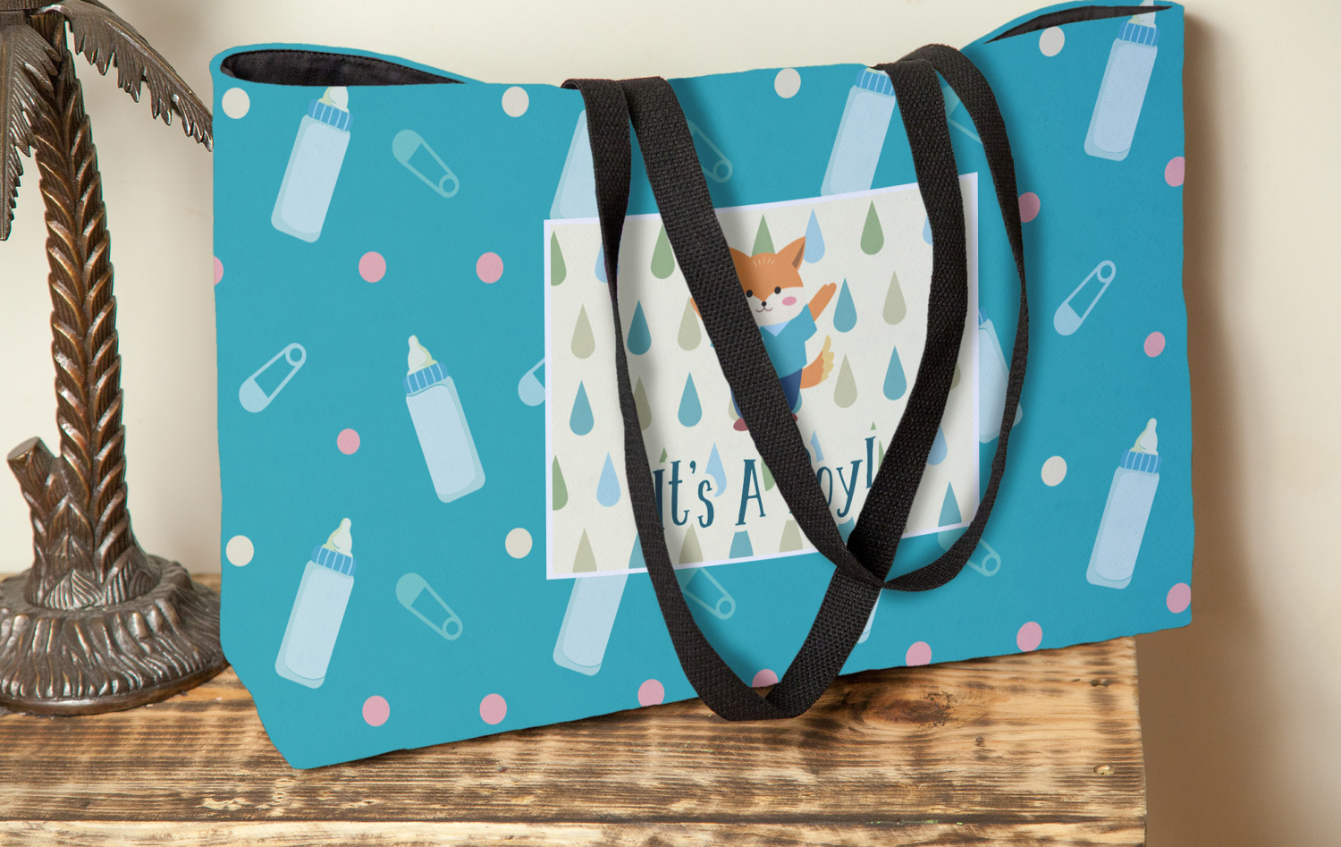 These beach totes are handmade here in the USA. Fabric is printed with your design. The tote is then sewn from the fabric pieces, lining and handles added.