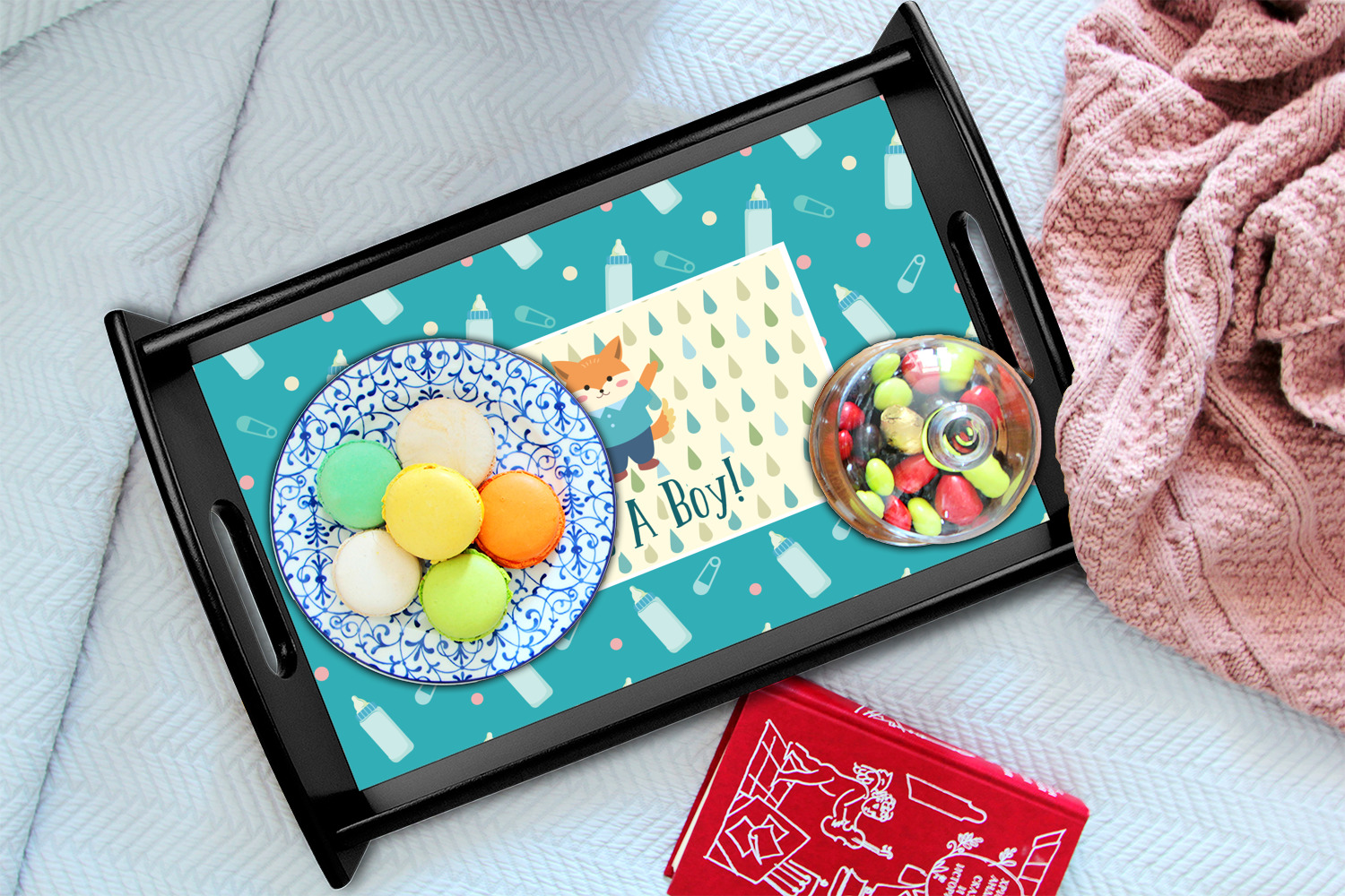 This design is for a new baby boy. The background is a bright teal color with baby bottles and safety pins. The secondary background has blue, teal, and green raindrops with a soft yellow behind them. The teal background almost acts as a frame around the yellow background. On the yellow background there is a fun little fox graphic celebrating with the words underneath him: "It's A Boy!"