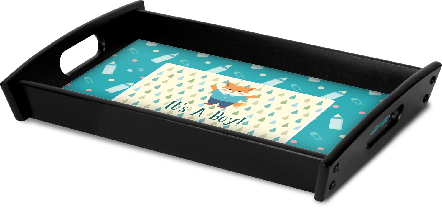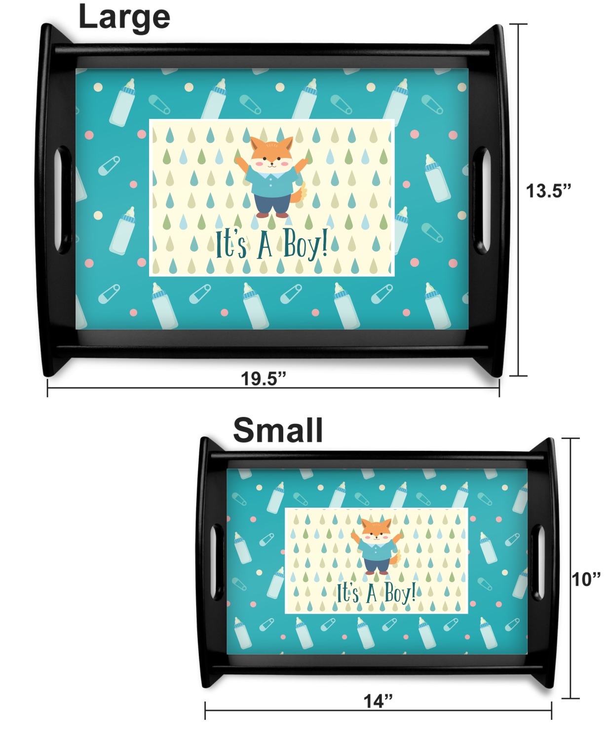 This serving tray with handles features square edges and two rounded sides, creating a very modern look. Each side is fabricated from a beautifully cut, natural wood. The bottom of the interior of the tray displays your customized design in bright, vibrant color. The tray is sold in both a black color and a natural wood look. Each variation of the wood serving tray has two sizes: Small, which is 14" x 10" x 2.25", and Large, which is 19.5" x 13.5" x 2.75".