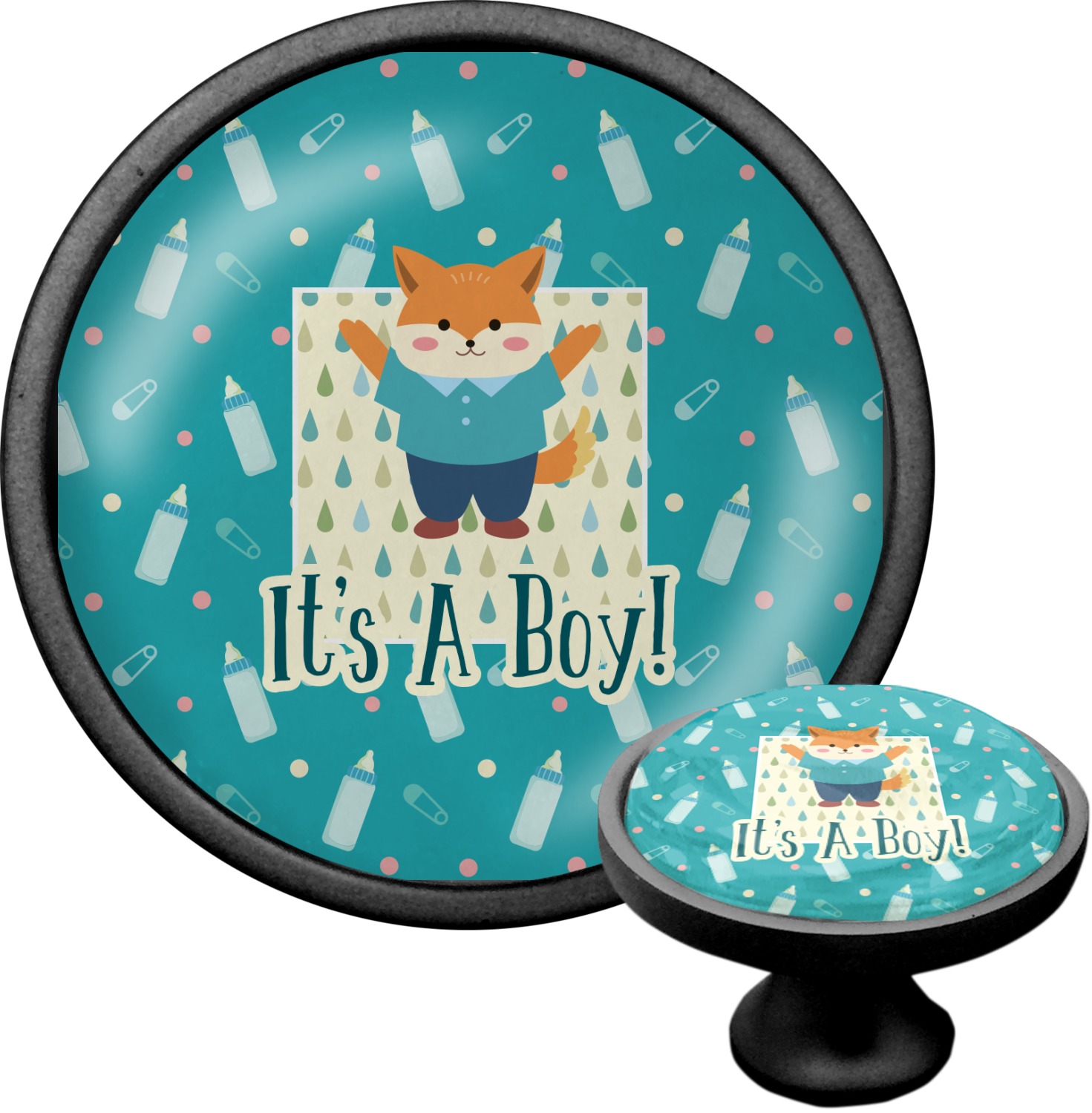 This design is for a new baby boy. The background is a bright teal color with baby bottles and safety pins. The secondary background has blue, teal, and green raindrops with a soft yellow behind them. The teal background almost acts as a frame around the yellow background. On the yellow background there is a fun little fox graphic celebrating with the words underneath him: "It's A Boy!"
