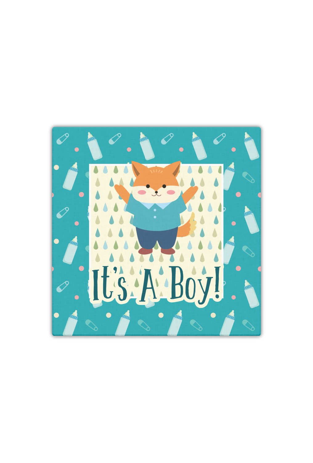 This design is for a new baby boy. The background is a bright teal color with baby bottles and safety pins. The secondary background has blue, teal, and green raindrops with a soft yellow behind them. The teal background almost acts as a frame around the yellow background. On the yellow background there is a fun little fox graphic celebrating with the words underneath him: "It's A Boy!"