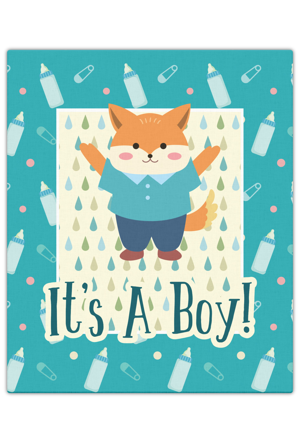 This design is for a new baby boy. The background is a bright teal color with baby bottles and safety pins. The secondary background has blue, teal, and green raindrops with a soft yellow behind them. The teal background almost acts as a frame around the yellow background. On the yellow background there is a fun little fox graphic celebrating with the words underneath him: "It's A Boy!"