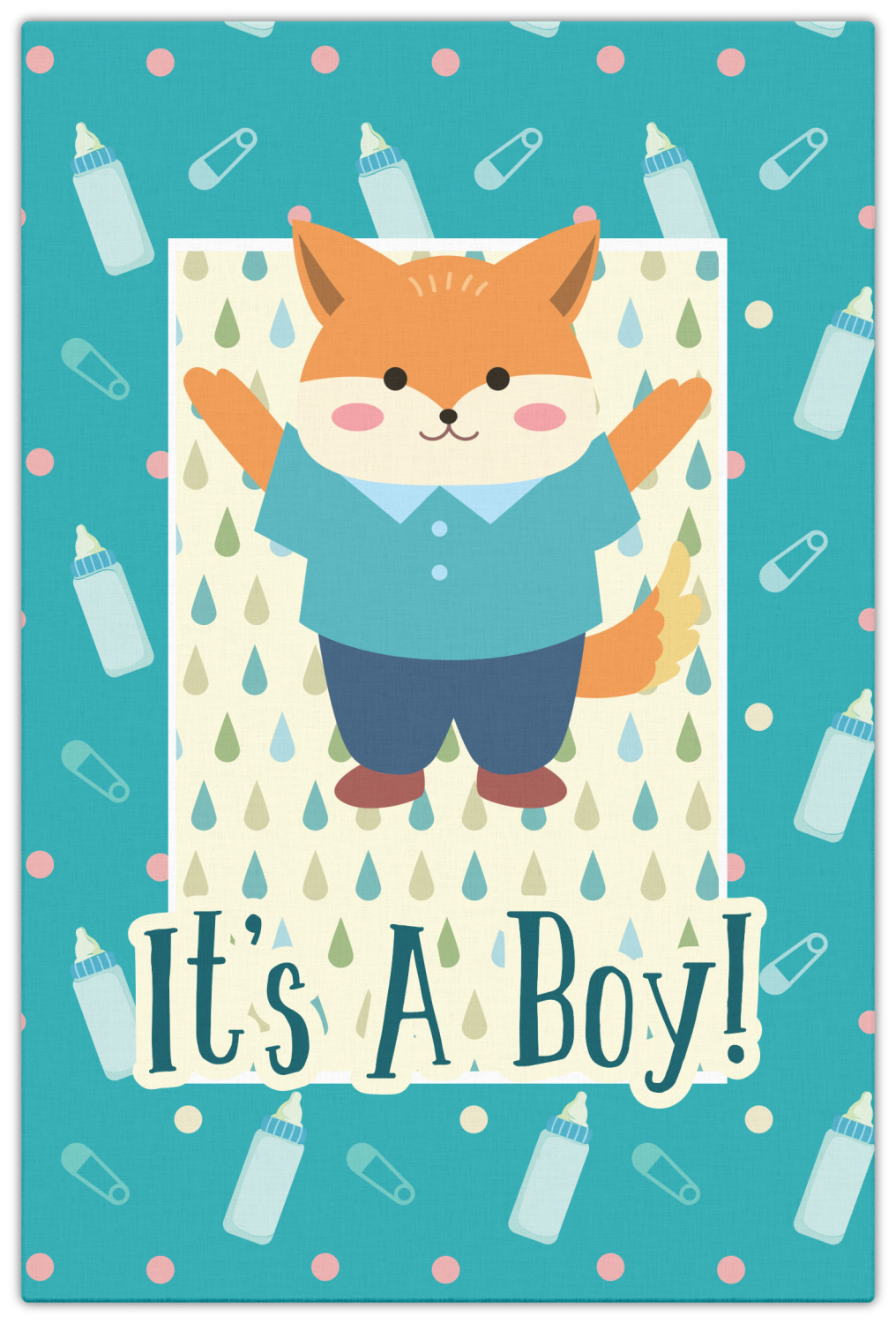 This design is for a new baby boy. The background is a bright teal color with baby bottles and safety pins. The secondary background has blue, teal, and green raindrops with a soft yellow behind them. The teal background almost acts as a frame around the yellow background. On the yellow background there is a fun little fox graphic celebrating with the words underneath him: "It's A Boy!"