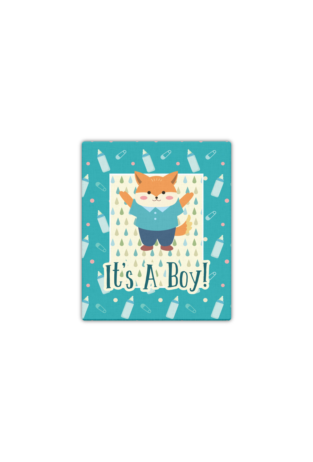 This design is for a new baby boy. The background is a bright teal color with baby bottles and safety pins. The secondary background has blue, teal, and green raindrops with a soft yellow behind them. The teal background almost acts as a frame around the yellow background. On the yellow background there is a fun little fox graphic celebrating with the words underneath him: "It's A Boy!"